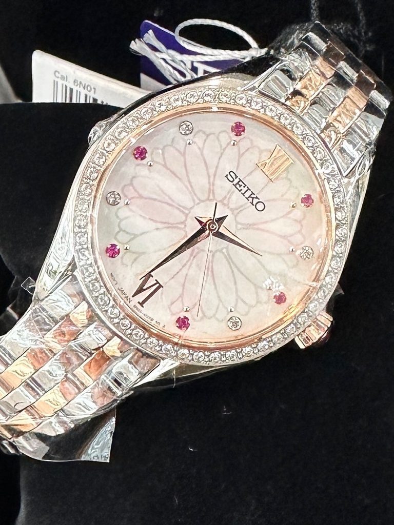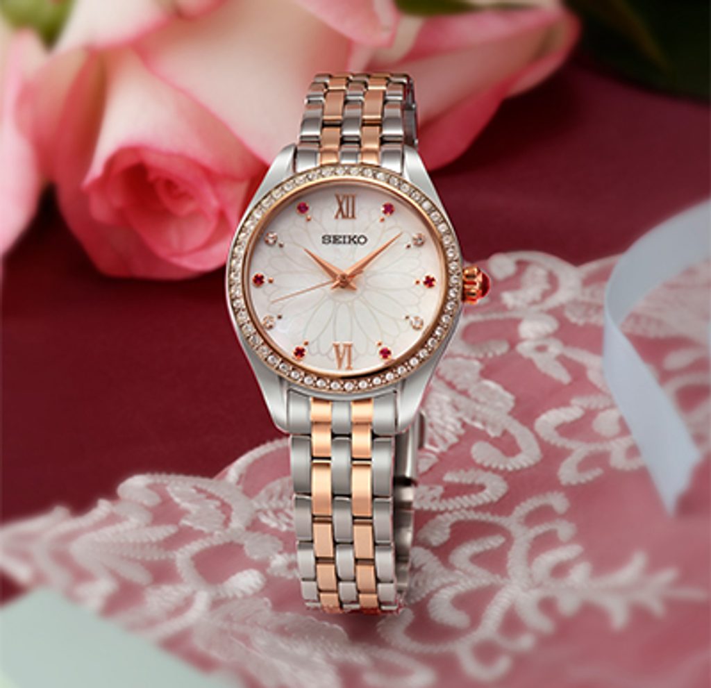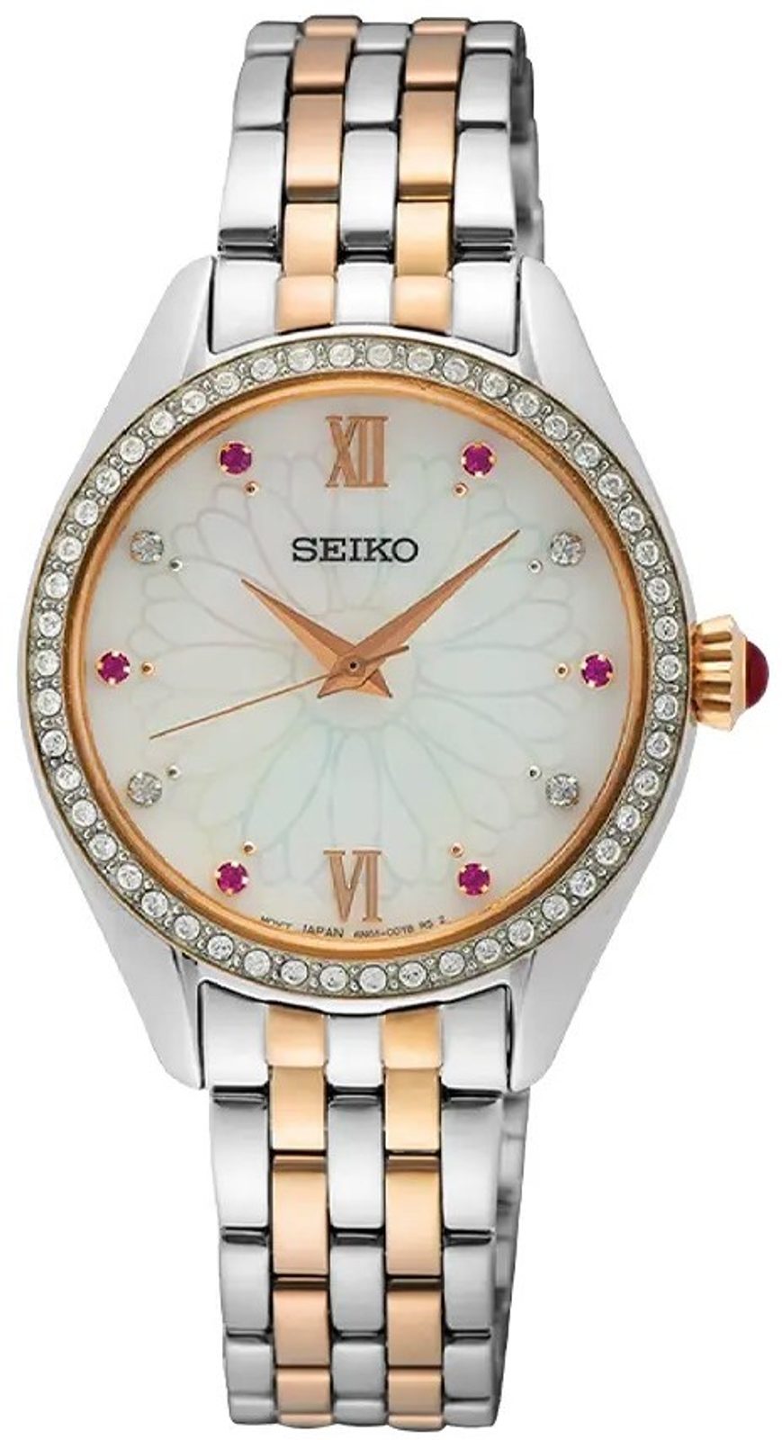 Hodinky Seiko SUR542P1 jsou díky svému zpracování a designu vhodným doplňkem do společnosti, ale také pro každodenní nošení. Pouzdro i náramek hodinek jsou vyrobené z nerezové oceli v barevném provedení bicolor. Zákaznicemi velice oblíbený jemný motivu na číselníku je vhodně doplněn elegantními dauphine ručkami, celek dotváří dobře čitelné kamínky na hodinových pozicích. Číselník je chráněn tvrzeným minerálním sklíčkem Hardlex. Celkový dojem dotváří také zdobení lunety decentními kamínky a červený kabošon, zasazený v korunce. Hodinky pohání kvalitní bateriový strojek firmy Seiko.