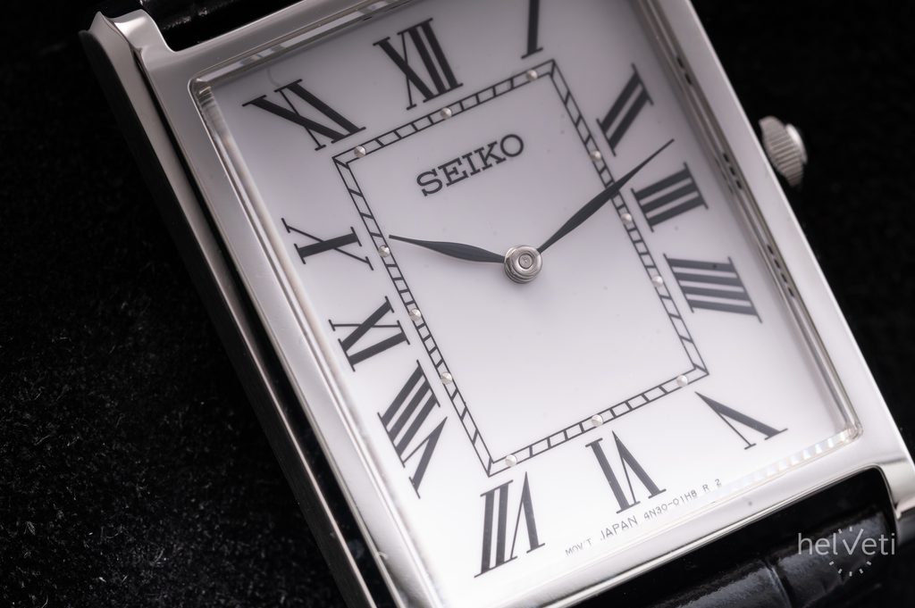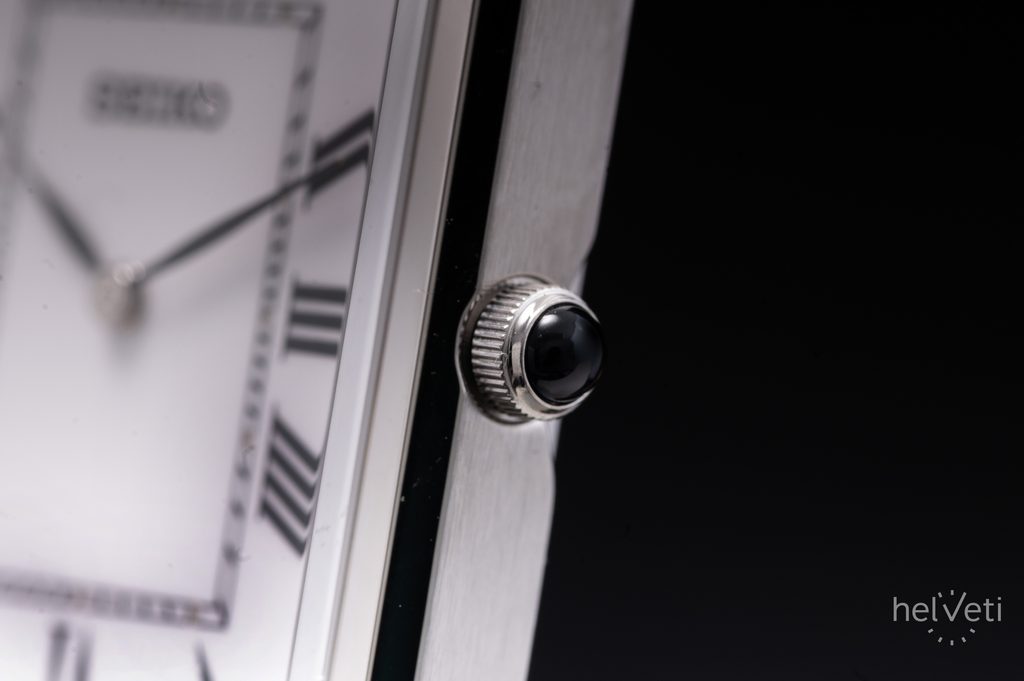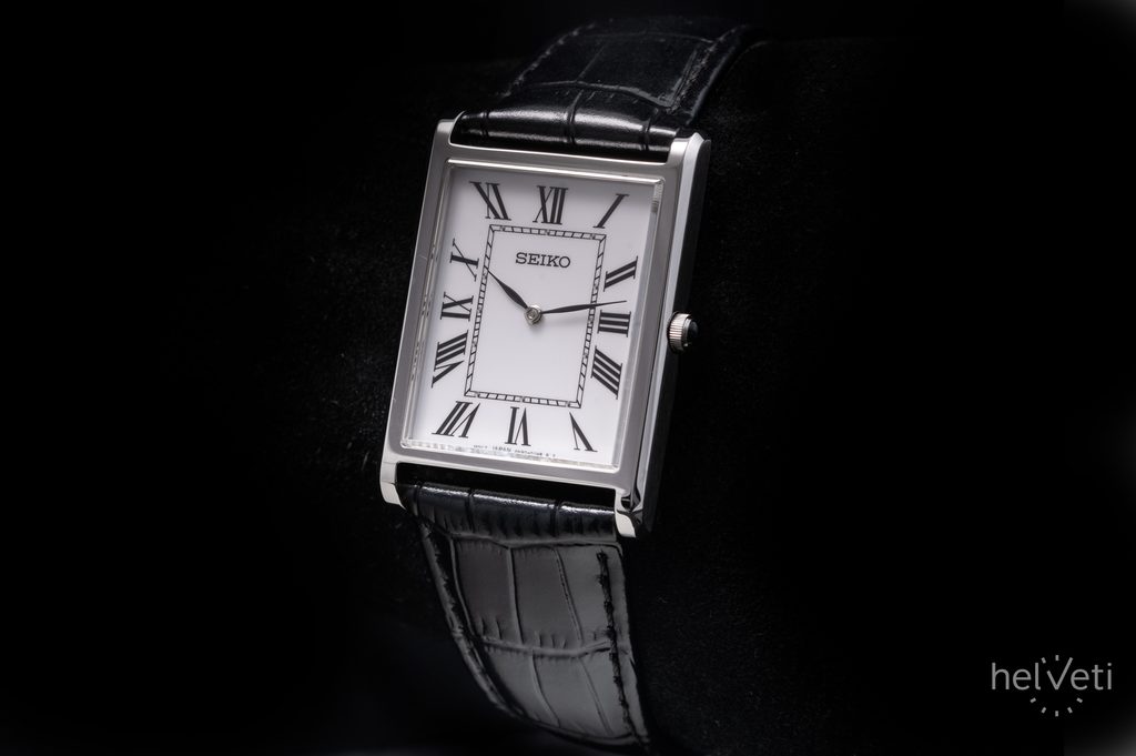 Hodinky Seiko SWR103P1 jsou díky svému zpracování a designu vhodným doplňkem do společnosti, ale také pro každodenní nošení. Obdélníkové pouzdro hodinek je vyrobené z nerezové oceli, doplňuje jej černý kožený řemínek s krokodýlím vzorem. Hodinky osloví svým klasickým a nadčasovým designem, bílým číselníkem, který vhodně doplňují černé listové ručky, římské číslice na hodinových pozicích a kolejnicová minutová stupnice. Číselník chrání safírové sklíčko s vysokou odolností proti poškrábání. Celkově elegantní dojem z hodinek dotváří také jemná korunka s černým kabošonem. Hodinky pohání kvalitní baterií napájený strojek Seiko 4N30.