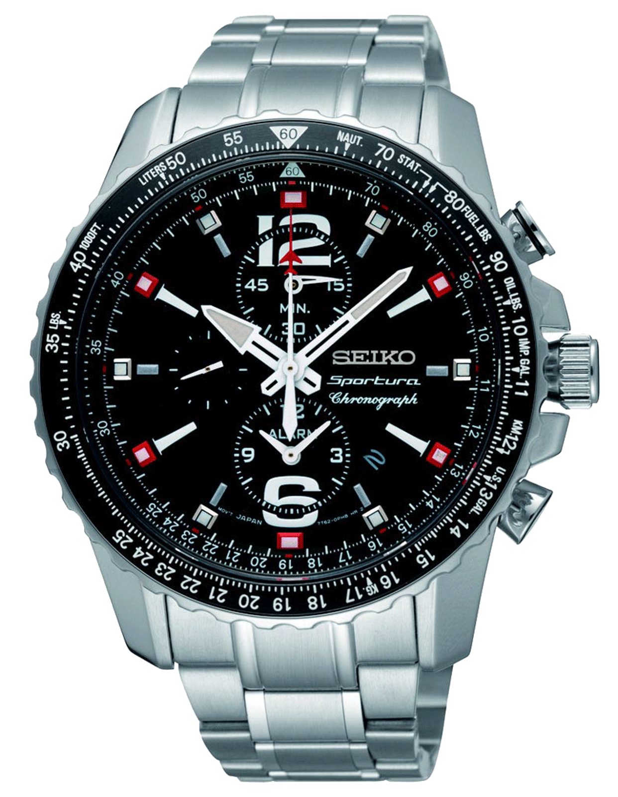 Pánské hodinky SEIKO pro milovníky různých sportů. Hodinky jsou určeny pro sportovní účely, ale také na běžné nošení. Hodinky patří do modelové řady SPORTURA . Hodinky jsou vyrobeny v celoocelovém provedení. Analogový ciferník černé barvy chrání safírové sklíčko. Z funkcí hodinky nabízejí datumovku, stopky, budík, tachymetr a letecké výpočty. Vodotěsnost tohoto modelu je 100M (určeno pro vodní sporty).