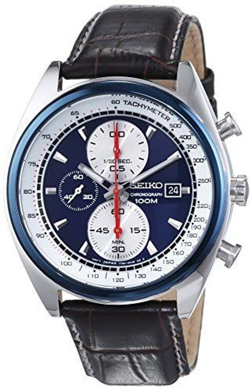 Pánské náramkové hodinky SEIKO. Hodinky jsou určené pro běžné užívání, ale také pro sportovní účely. Model disponuje strojkem Quartz. Hodinky mají nerezové ocelové pouzdro a hnědý kožený řemínek. Analogový ciferník modré barvy chrání minerální sklíčko Hardlex. Z funkcí hodinky nabízejí datumovku, stopky a tachymetr. Vodotěsnost tohoto modelu je 100M (určeno pro vodní sporty).