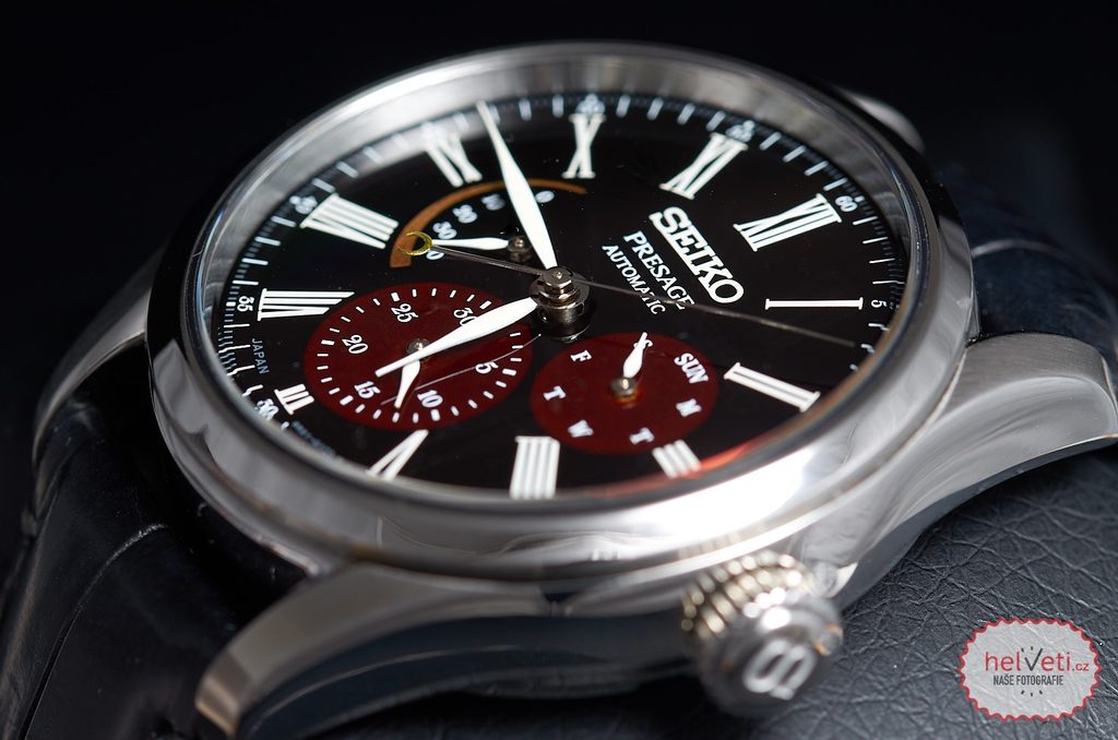 Barvy použité na ciferníku odkazují na japonskou fascinaci měsícem a vyjadřují noční oblohu s Měsícem tesně před rozbřeskem. Noční oblohu s měsícem, na níž pomalu vládu přebírá den, znázorňuje celý ciferník s černočerným lakem uruši. Srpek měsíce představuje zlatá rezerva nátahu provedená technikou maki-e a předobrazem hlubokou červení opatřených čítačů data a dne je obloha před svítáním, které je docíleno technikou byakudan-nuri.
