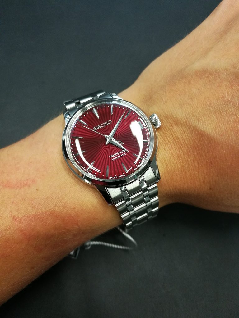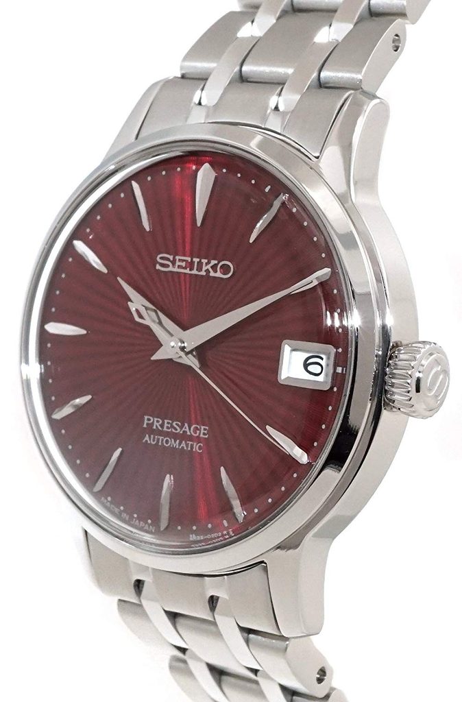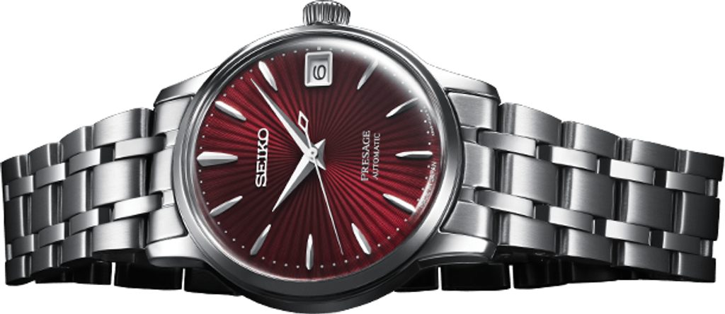 Model Seiko SRP853J1 má červený ciferník opatřený typickou strukturou a plastickými indexy na pozicích hodin. Pohání jej automatický kalibr 4R35, který má 23 kamenů a rezervu chodu až 41 hodin. Precizní práci automatického strojku můžete sledovat průhledným dýnkem hodinek. Číselník chrání klenuté sklíčko Hardlex, zintenzivňující hru světla na strukturovaném povrchu. Ocelové pouzdro hodinek je doplněno ocelovým náramkem dodávajícím hodinkám celkově velmi elegantní vzhled. Vodotěsnost tohoto modelu je 50 m. Nechybí ani ukazatel data na pozici 3. hodiny. Průměr pouzdra činí pro dámská zápěstí ideálních 33,8 mm.