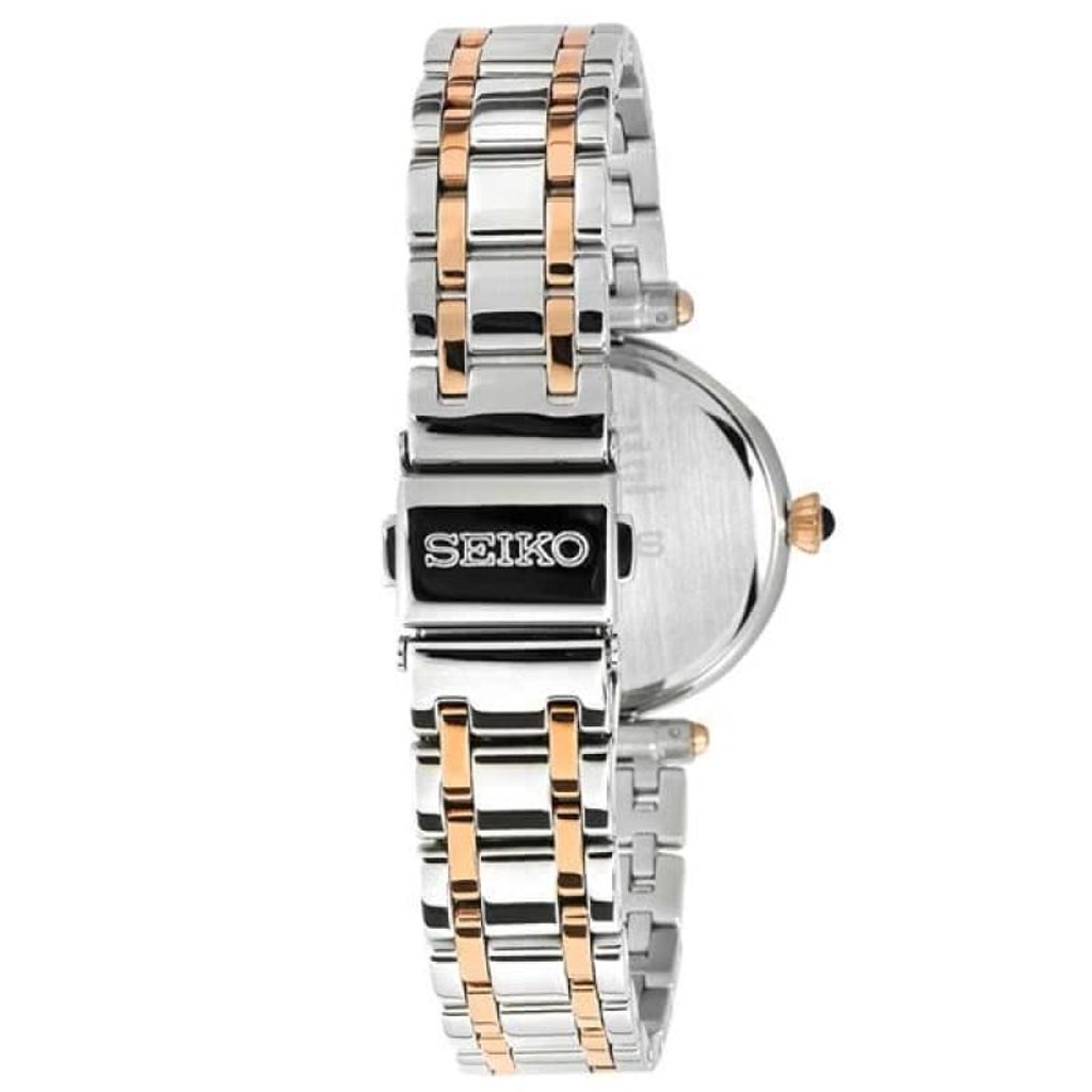 Hodinky Seiko SRZ534P1 jsou díky svému zpracování a designu vhodným doplňkem do společnosti, ale také pro každodenní nošení. Pouzdro i náramek hodinek jsou vyrobeny z nerezové oceli v barevné úpravě bicolor. Zákaznicemi velice oblíbený perleťový číselník je vhodně doplněn aplikací diamantů na pozicích hodin a použitím růžovozlatých ruček. Chráněn je pak safírovým sklíčkem. Celkový dojem dotváří také kabošon zasazený v korunce. Hodinky pohání kvalitní quartzový strojek firmy Seiko.