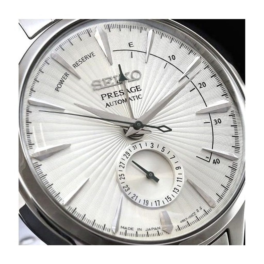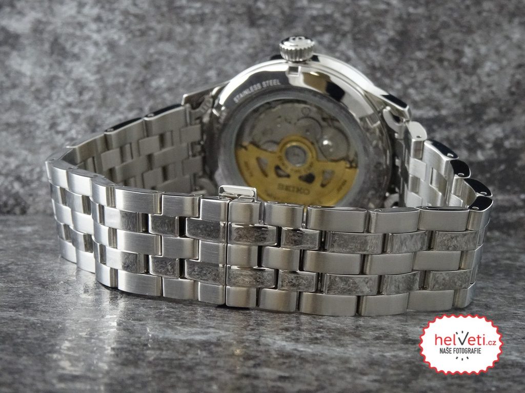 Model Seiko SSA341J1 má krémový ciferník opatřený typickou strukturou a plastickými indexy na pozicích hodin. Pohání jej automatický kalibr 4R57, který má 29 kamenů a rezervu chodu až 41 hodin. Ukazatel rezervy chodu je velmi přehledně a zároveň citlivě proveden přímo na ciferníku hodinek. Precizní práci automatického strojku můžete sledovat průhledným dýnkem hodinek. Číselník chrání klenuté sklíčko Hardlex, zintenzivňující hru světla na strukturovaném povrchu. Celoocelové provedení hodinkám dodává velmi elegantní vzhled a zároveň je činí ideálním doplňkem pro mnoho příležitostí. Vodotěsnost tohoto modelu je 50 m. Nechybí ani ukazatel data v subciferníku nad 6. hodinou. Průměr pouzdra činí ideálních 40,5 mm.