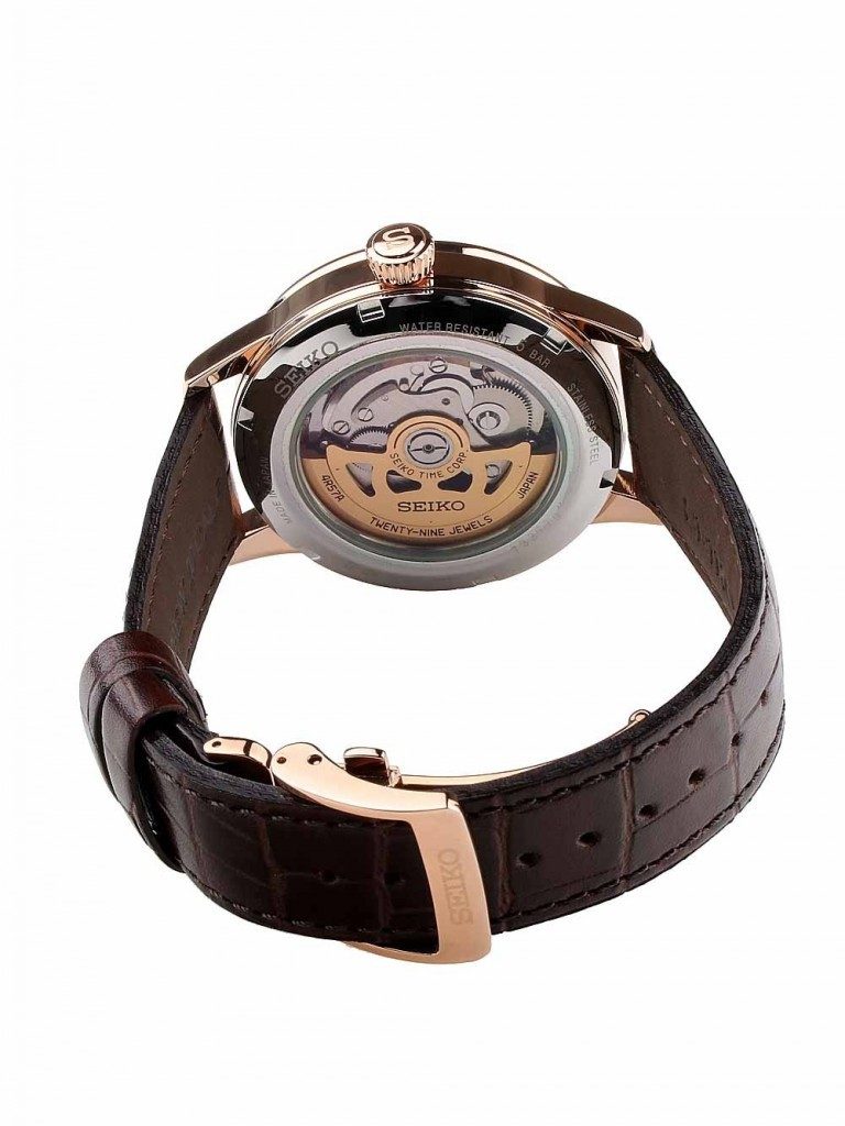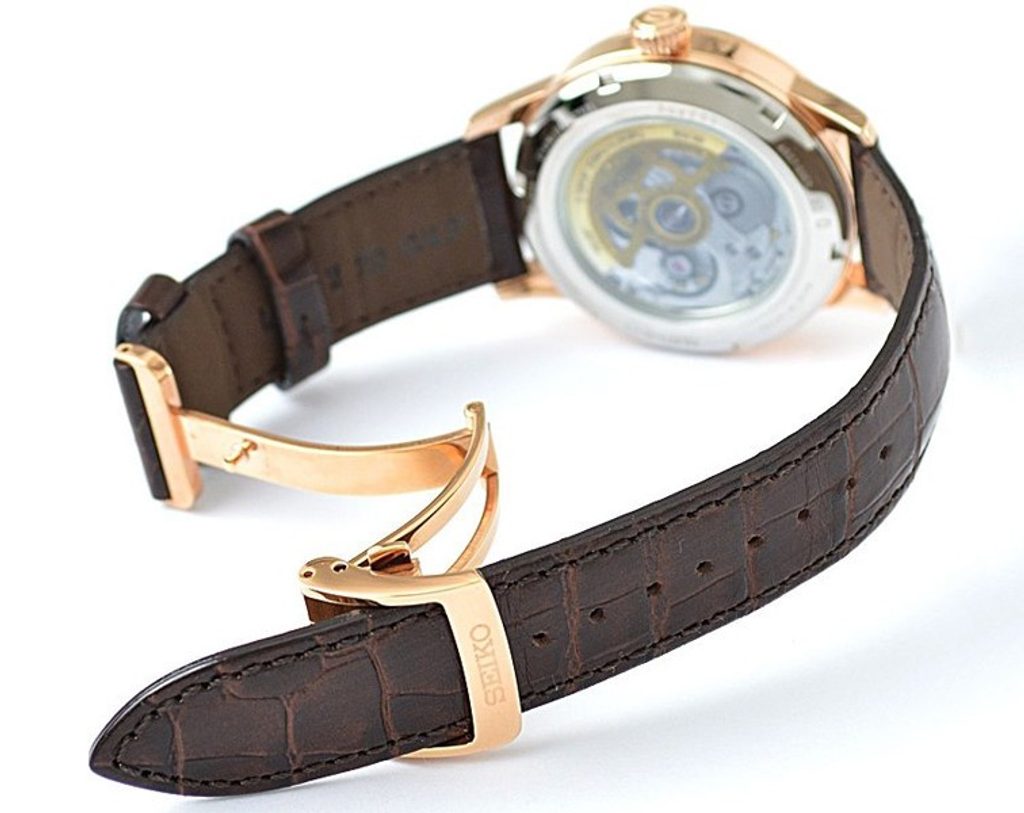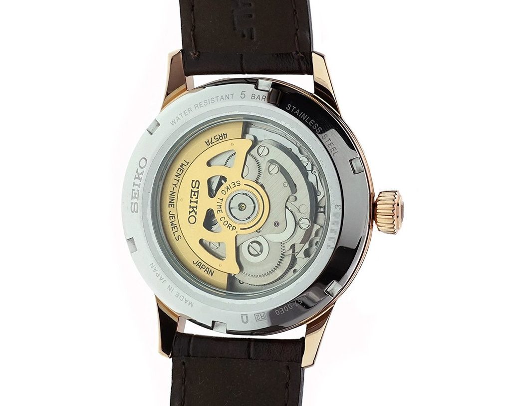 Model Seiko SSA346J1 má stříbřitý ciferník s jemnými barevnými nádechy, opatřený typickou strukturou a plastickými indexy na pozicích hodin. Pohání jej automatický kalibr 4R57, který má 29 kamenů a rezervu chodu až 41 hodin. Ukazatel rezervy chodu je velmi přehledně a zároveň citlivě proveden přímo na ciferníku hodinek. Precizní práci automatického strojku můžete sledovat průhledným dýnkem hodinek. Číselník chrání klenuté sklíčko Hardlex, zintenzivňující hru světla na strukturovaném povrchu. Zlacené ocelové pouzdro hodinek je doplněno kvalitním koženým řemínkem hnědé barvy se vzorem kokodýlí kůže, dodávajícím hodinkám velmi elegantní vzhled. Vodotěsnost tohoto modelu je 50 m. Nechybí ani ukazatel data v subciferníku nad 6. hodinou. Průměr pouzdra činí ideálních 40,5 mm.