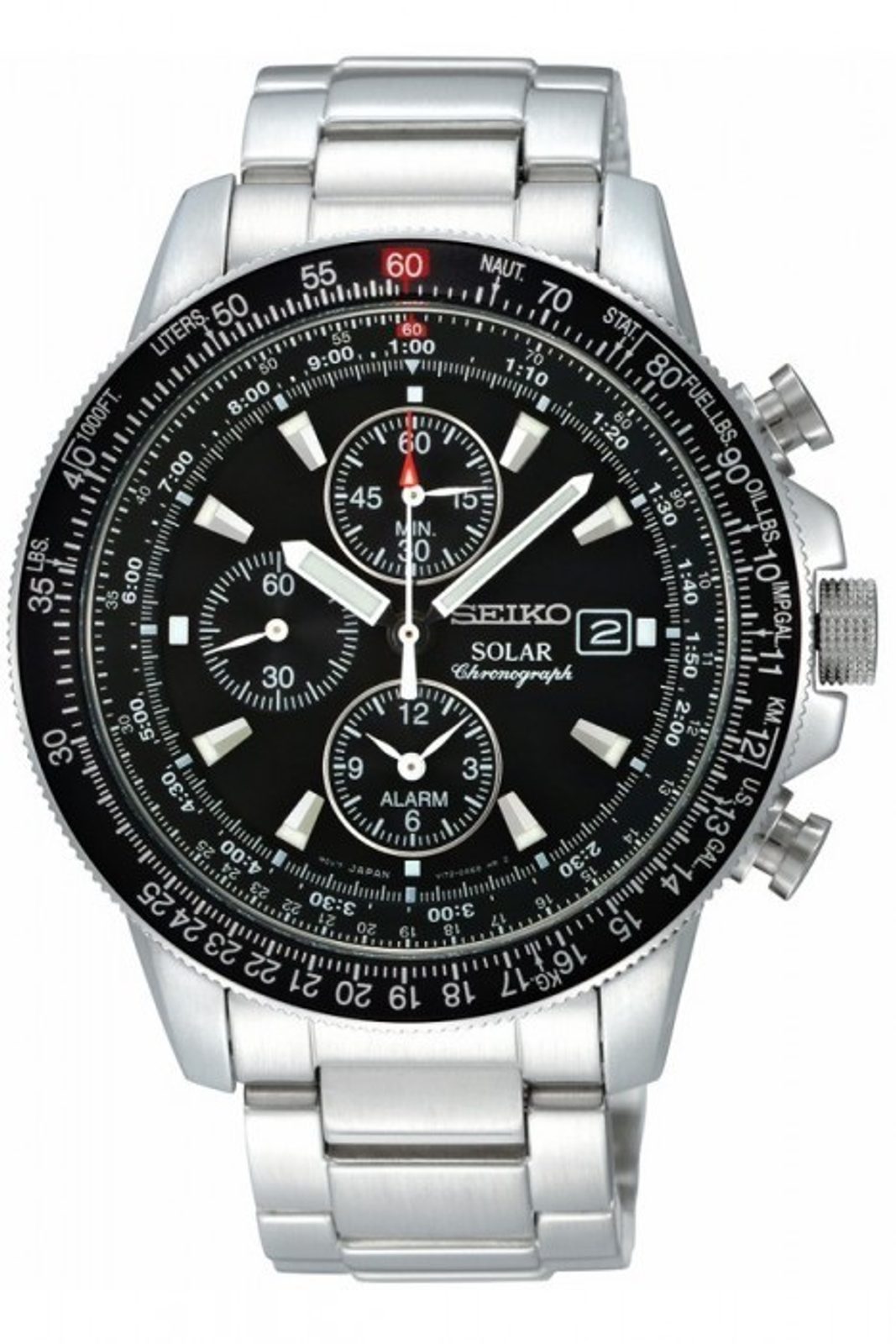 Pánské náramkové hodinky Seiko. Hodinky jsou určeny na běžné nošení, ale také do společnosti. Model disponuje solárním pohonem. Hodinky jsou vyrobeny v celocelovém provedení. Analogový ciferník černé barvy chrání minerální sklíčko Hardlex. Z funkcí hodinky nabízejí datumovku, stopky a budík. Vodotěsnost tohoto modelu je 100M (určeno pro vodní sporty).