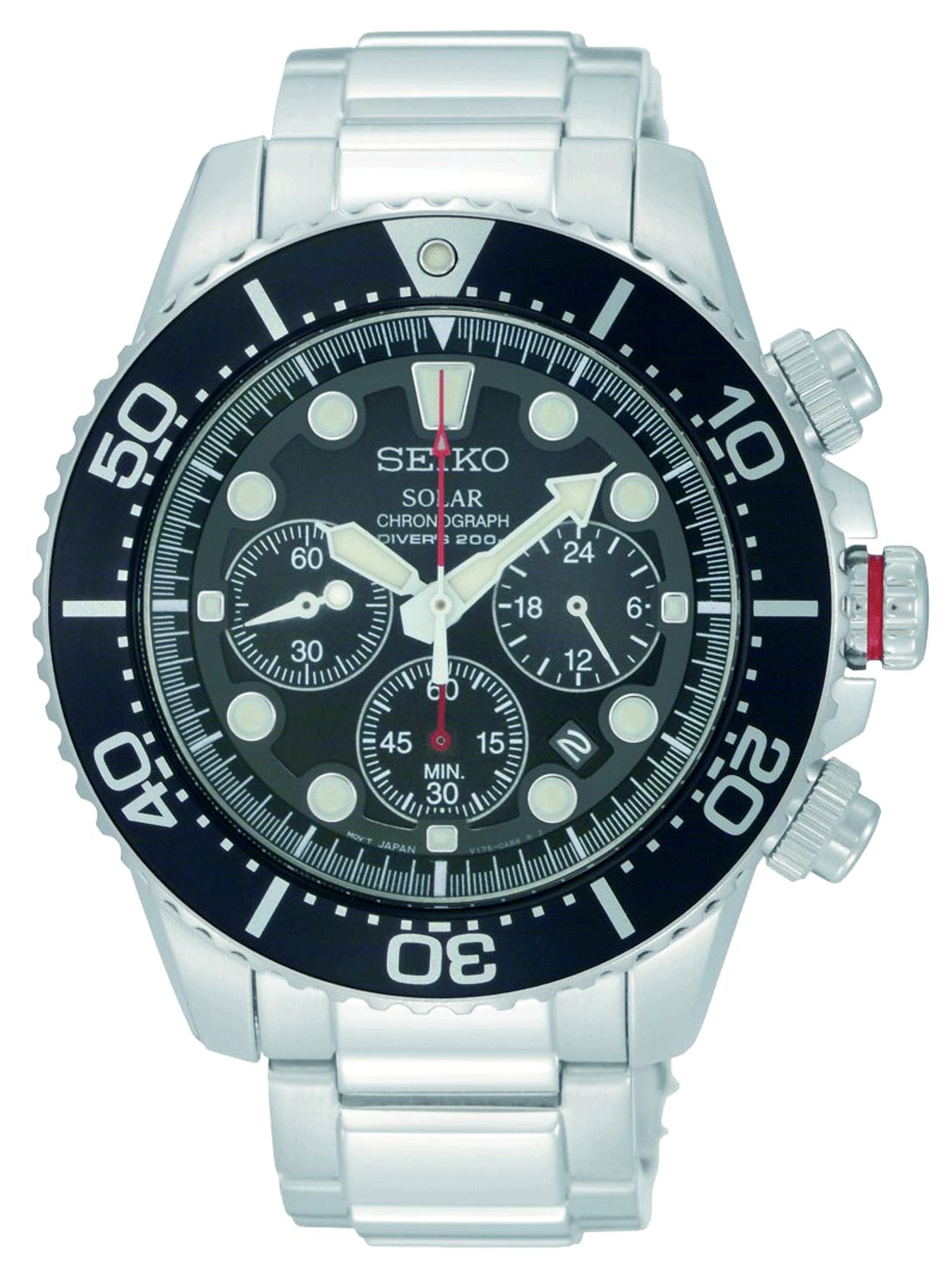 Pánské náramkové hodinky Seiko. Hodinky jsou určeny na běžné nošení, ale také do společnosti. Model disponuje solárním pohonem. Hodinky jsou vyrobeny v celoocelovém provedení. Analogový ciferník černé barvy chrání minerální sklíčko Hardlex. Z funkcí hodinky nabízejí datumovku a stopky Vodotěsnost tohoto modelu je 200M (potápění). Model disponuje šroubovací korunkou pro dokonalé utěsnění.