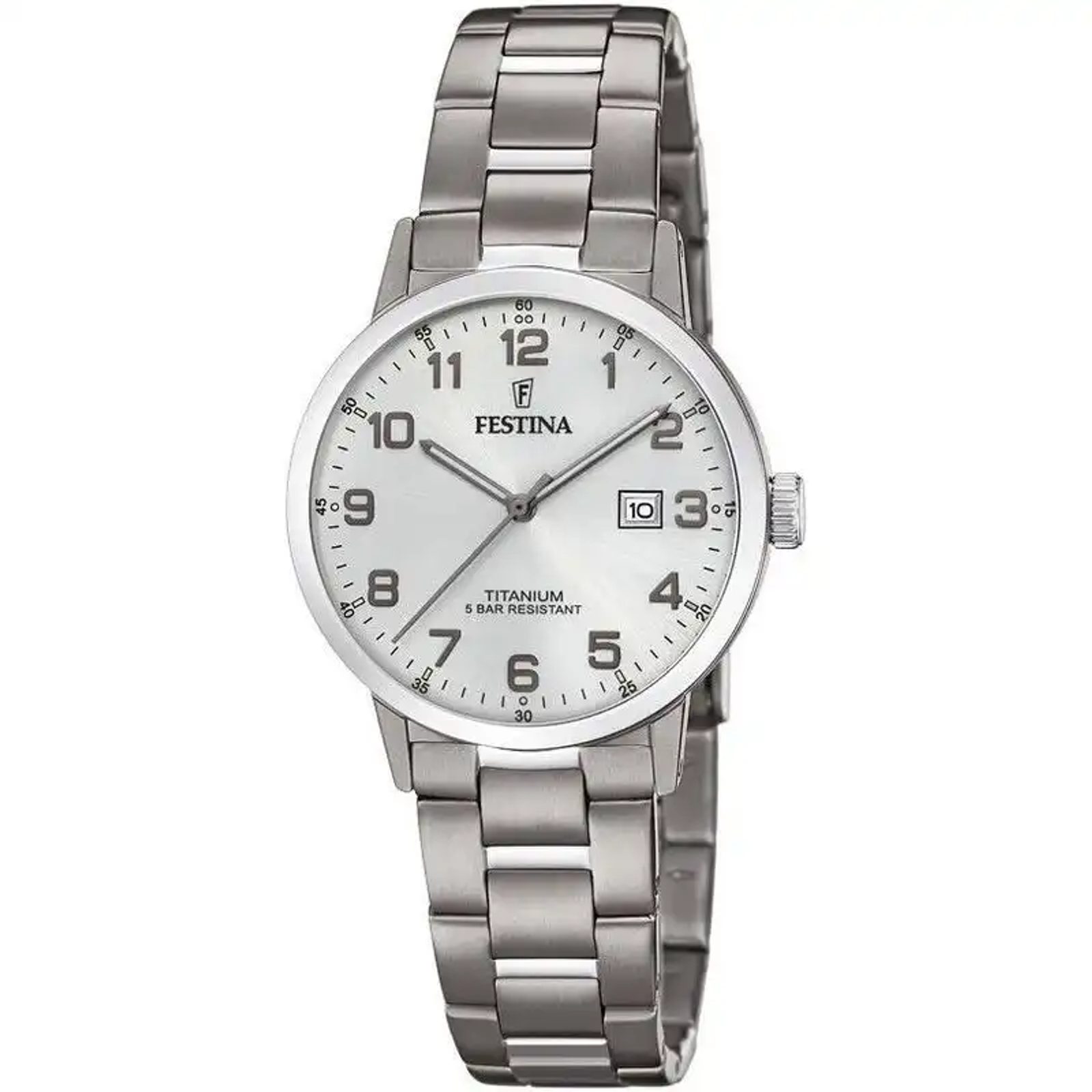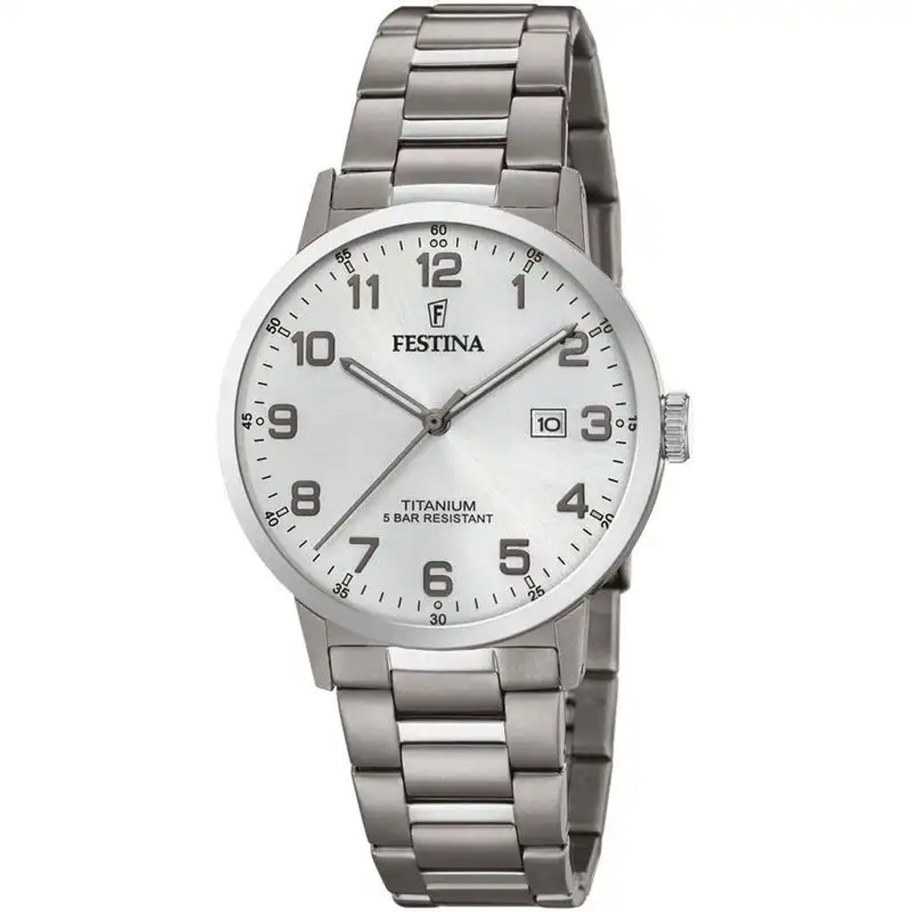 Hodinky značky Festina jsou jako stvořené pro všechny muže, co si potrpí na klasické doplňky vysoké kvality. Stříbrný ciferník v klasickém stylu zdobí číselné indexy s luminiscenčními ručičkami. Nechybí ani užitečná datumovka na pozici tří hodin. Titanový tah spolu s titanovým pouzdrem tvoří dokonalý celek. Titan je velice lehký, odolnější než ocel a antialergický. Vsaďte na klasické hodinky Festina a užívejte si pozornost širokého okolí.