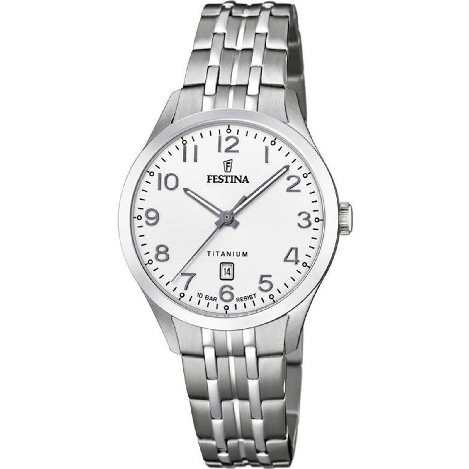 Hodinky značky Festina jsou jako stvořené pro všechny, co si potrpí na klasické doplňky vysoké kvality. Bílý ciferník v klasickém stylu zdobí číselné indexy s luminiscenčními ručičkami. Nechybí ani užitečná datumovka na pozici šesti hodin. Titanový tah spolu s titanovým pouzdrem tvoří dokonalý celek. Titan je velice lehký, odolnější než ocel a antialergický. Vsaďte na klasické hodinky Festina a užívejte si pozornost širokého okolí.
