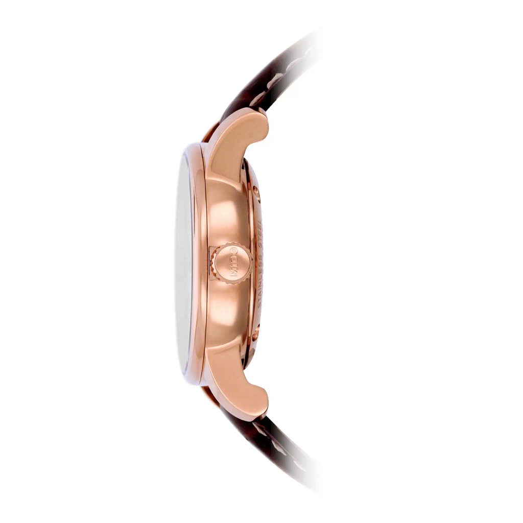Hodinky Mido M8600.2.21.8 mají pouzdro vyrobené z ušlechtilé oceli 316L s PVD úpravou v barvě růžového zlata, které vhodně doplňuje kožený řemínek. V pouzdře spolehlivě tiká švýcarský mechanický strojek Mido Caliber 80 (základem je ETA C07.611) s automatickým nátahem. Ten pracuje na frekvenci 21600 polokmitů za hodinu, disponuje 25 kameny a především prodlouženou rezervou chodu 80 hodin. Činnost tohoto strojku lze pozorovat průhledným dýnkem. Na pozici 4-5. hodiny najdeme praktický ukazatel data.