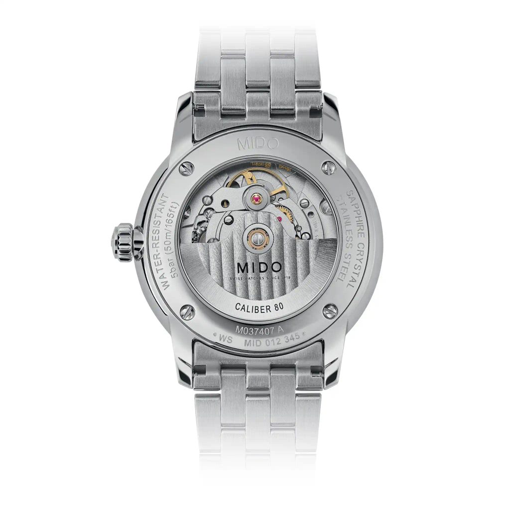 Hodinky Mido M037.407.11.031.00 mají pouzdro včetně náramku vyrobené z ušlechtilé oceli 316L. V něm spolehlivě tiká švýcarský mechanický strojek Mido Caliber 80 (základem je ETA C07.611) s automatickým nátahem. Ten pracuje na frekvenci 21600 polokmitů za hodinu, disponuje 25 kameny a především prodlouženou rezervou chodu 80 hodin. Činnost tohoto strojku lze pozorovat průhledným dýnkem. Na pozici 3. hodiny najdeme praktický ukazatel data.