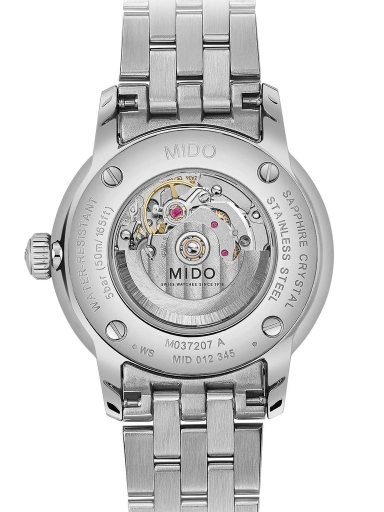 Hodinky Mido M037.407.22.031.01 mají pouzdro včetně náramku vyrobené z ušlechtilé oceli 316L s částečnou PVD úpravou v barvě růžového zlata. V něm spolehlivě tiká švýcarský mechanický strojek Mido Caliber 80 (základem je ETA C07.611) s automatickým nátahem. Ten pracuje na frekvenci 21600 polokmitů za hodinu, disponuje 25 kameny a především prodlouženou rezervou chodu 80 hodin. Činnost tohoto strojku lze pozorovat průhledným dýnkem. Na pozici 3. hodiny najdeme praktický ukazatel data.