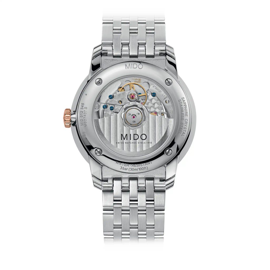 Hodinky Mido M027.407.22.010.01 mají pouzdro včetně náramku vyrobené z ušlechtilé oceli 316L s částečnou PVD úpravou v barvě růžového zlata. V něm spolehlivě tiká švýcarský mechanický strojek Mido Caliber 72 (základem je ETA A31.111) s automatickým nátahem. Ten pracuje na frekvenci 25200 polokmitů za hodinu, disponuje 21 kameny a prodlouženou rezervou chodu 72 hodin. Největší zajímavostí je pak funkce ukazatele měsíční fáze, který je zobrazen formou "úsměvu" ve spodní části číselníku. Činnost tohoto strojku lze pozorovat průhledným dýnkem.
