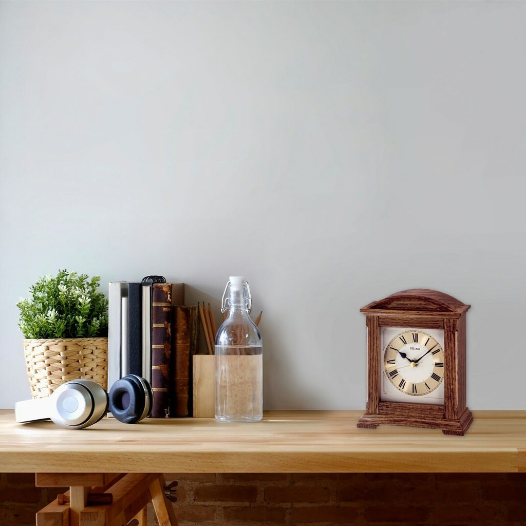 Stolní hodiny Seiko QXG123B mají dřevěné pouzdro a skrývají v sobě bateriový quartzový strojek. Ten vyniká plynulým chodem sekundové ručky a naprosto tichým chodem.