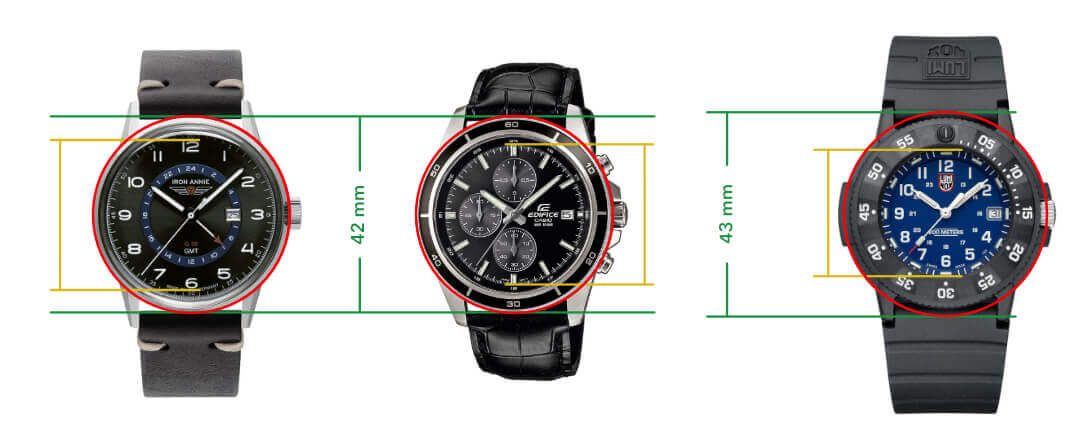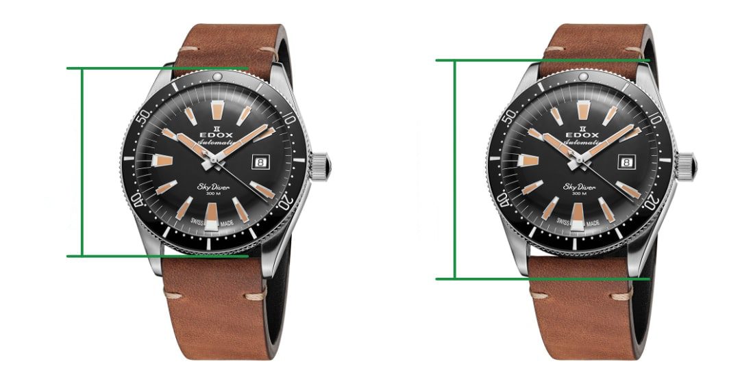 Uspořádání všech prvků na hodinkách a jejich design mohou velikost hodinek opticky výrazně měnit. Červeně: linie nejdelších nožek, žlutě: velikost číselníku, zeleně: velikost pouzdra.