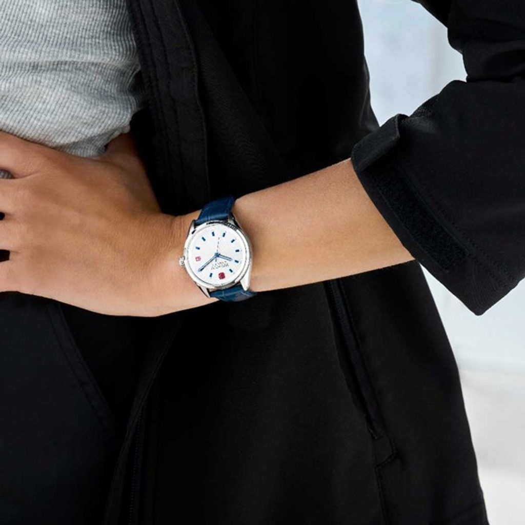 Ciferník bílé barvy modrými detaily chrání safírové sklíčko s antireflexní úpravou, díky čemuž jsou hodinky odolné proti poškrábání. Indexy i ručičky hodinek jsou opatřeny luminiscencí, což zaručuje dobrou čitelnost.