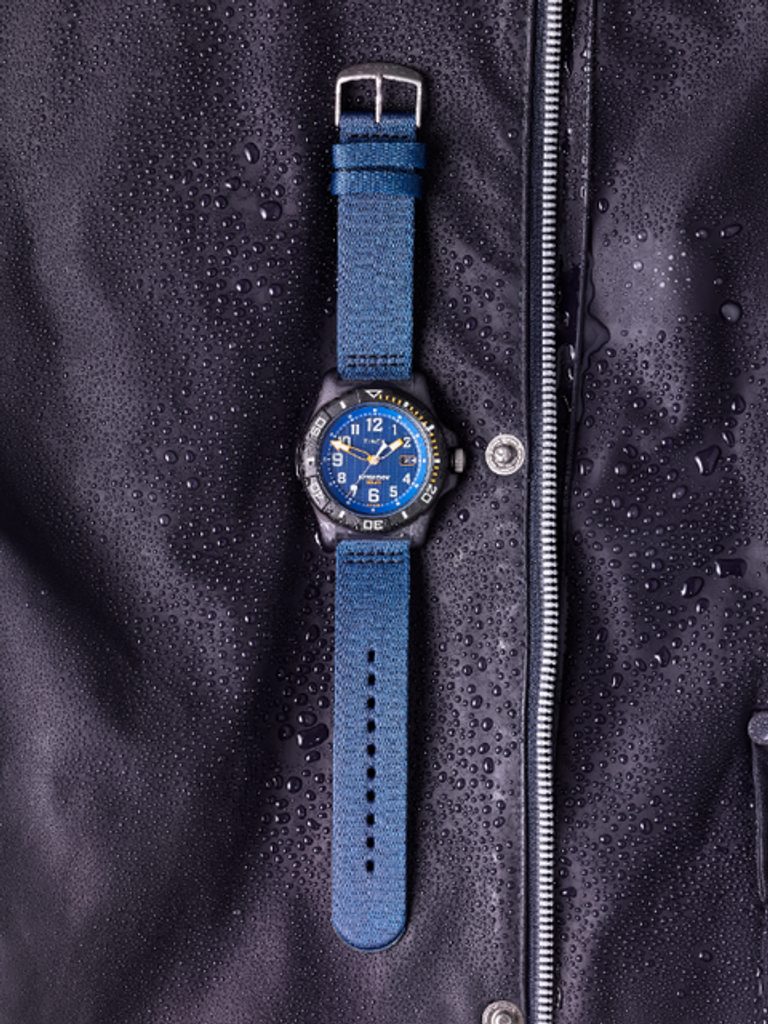 Baterií poháněné quartzové hodinky disponují voděodolností 50 m (5 ATM), díky čemuž zvládnou nejen základní kontakt s vodou při mytí rukou a dešti. Model je vybaven modrým páskem o šířce 22 mm ze 100% recyklovaného materiálu, stejně jako pouzdro.