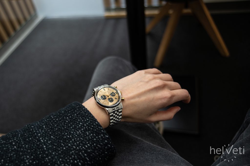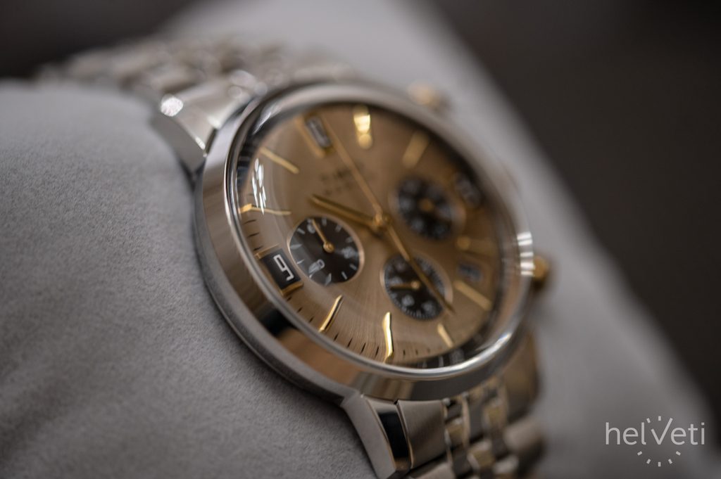 Stříbrné pouzdro a tah těchto hodinek vkusně doplňují zlaté doplňky v podobě postranních tlačítek, korunky a ručiček, které pěkně ladí s krásným ciferníkem v syté, hřejivé barvě šampaňského.