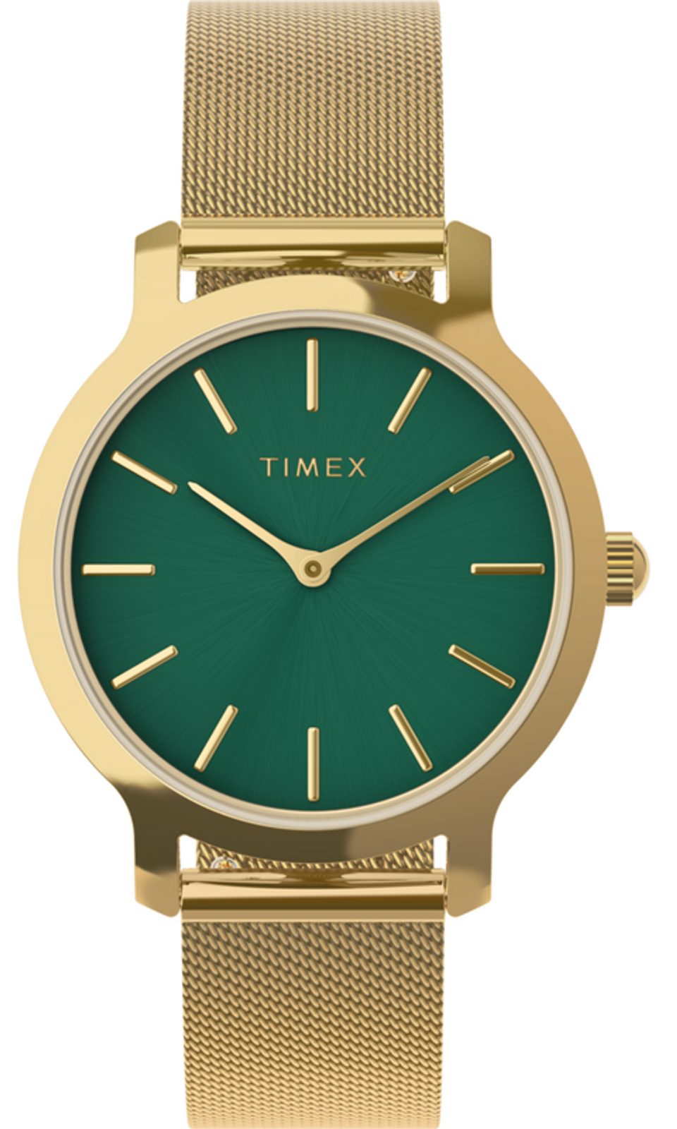 Mosazné pouzdro o průměru 31 mm je opatřeno PVD povrchovou úpravou ve zlatém provedení. Tmavě zelený číselník slouží jako podklad pro štíhlé ručky a indexy - obojí v barvě pouzdra. Vše chrání kvalitní minerální sklíčko.