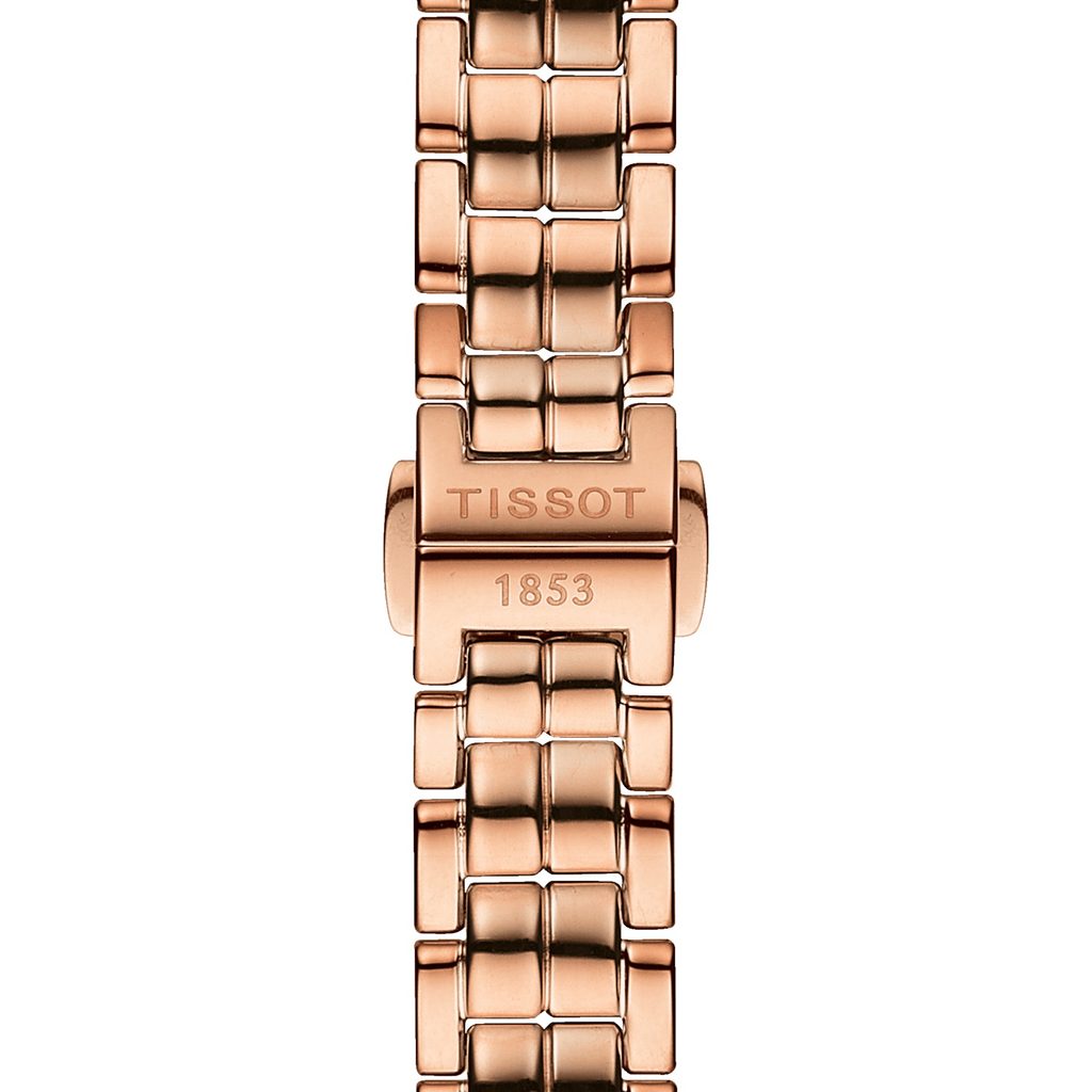 Dámské hodinky Tissot Flamingo T094.210.33.116.02 jsou dámské elegantní hodinky z řady T-Lady, které vás okouzlí svým minimalistickým vzhledem a precizním zpracováním. Ocelové pouzdro hodinek je doplněno jemným ocelovým náramkem, zakončeným motýlovou sponou. Pouzdro i náramek hodinek je opatřeno PVD úpravou povrchu, dodávající hodinkám růžovozlatou barvu. Perleťový číselník chrání safírové sklíčko, jež je odolné vůči poškrábání. Na pozicích indexů najdeme 12 diamantů.