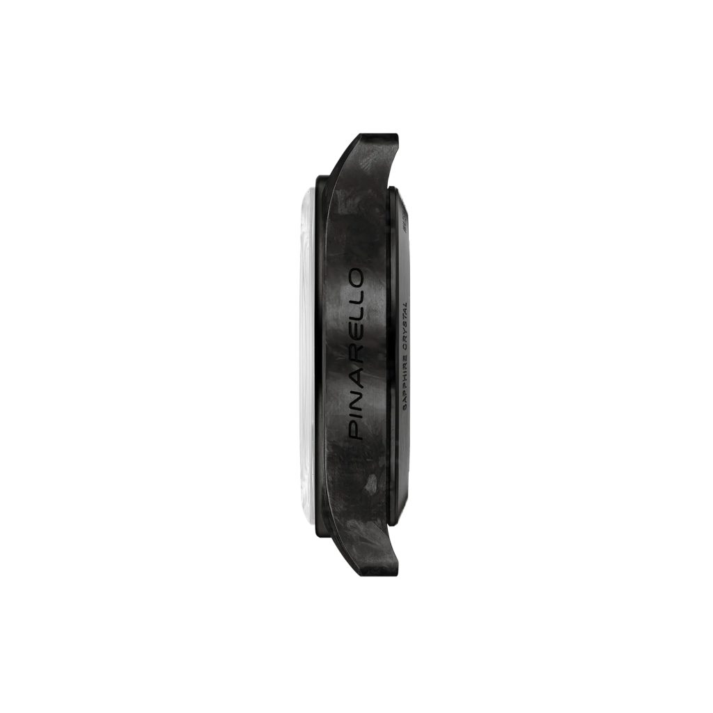 Pouzdro hodinek je vyrobeno v kombinaci ušlechtilé oceli a karbonu - kompozitního materiálu složeného z uhlíkových vláken. Pouzdro čerpá přímou inspiraci z charakteristického designu vidlice Pinarello, což hodinkám dodává jedinečnou identitu. Černě niklované indexy potažené vrstvou Super-LumiNova® zajišťují optimální čitelnost a přinášejí rafinovanou technickou estetiku. Ručičky s drážkovanými fazetami zachycují světlo jemnými odlesky, zatímco vteřinová ručička – ve tvaru písmene „P“ značky Pinarello a s povrchovou úpravou Borealis, charakteristickým barevným vyjádřením hluboce spjatým s identitou značky, přidává výrazný nádech barvy a pohybu. Tento vyjímečný číselník chrání safírové sklíčko s antireflexní vrstvou, jenž je vysoce odolné vůči poškrábání.