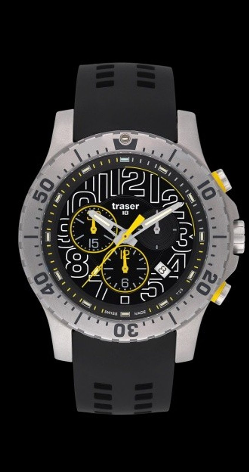 Novinka roku 2015 – Traser Elite Chronograph. Designově velmi zajímavé hodinky, které disponují výraznými číslicemi na ciferníku hodinek, který je vyveden v černo-žluté barvě. Model dále nabízí: stopky, datumovku s trigalightem, otočnou lunetou,vodotěsnost do 200m a vysokou odolnost díky dvojitému ocelovému pouzdru. Hodinky Traser Elite Chronograph z řady Sport se vyrábí na silikonovém řemínku nebo ocelovém náramku. Na silikonu váží 127g a na ruce jsou velmi příjemné.