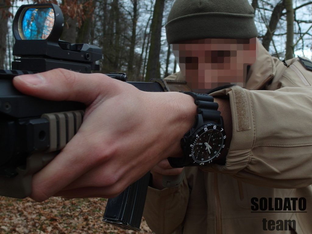 Hodinky jsou díky dvojité konstrukci pouzdra a vysoké vodotěsnosti vhodné do velmi náročného prostředí. Ve dne krásně kontrastují bílé indexy na černém pozadí, zatímco v noci oceníte promyšlnou luminiscenci - zeleně číslovky 1-11, 12 oranžově, ručičky a luneta také zeleně.