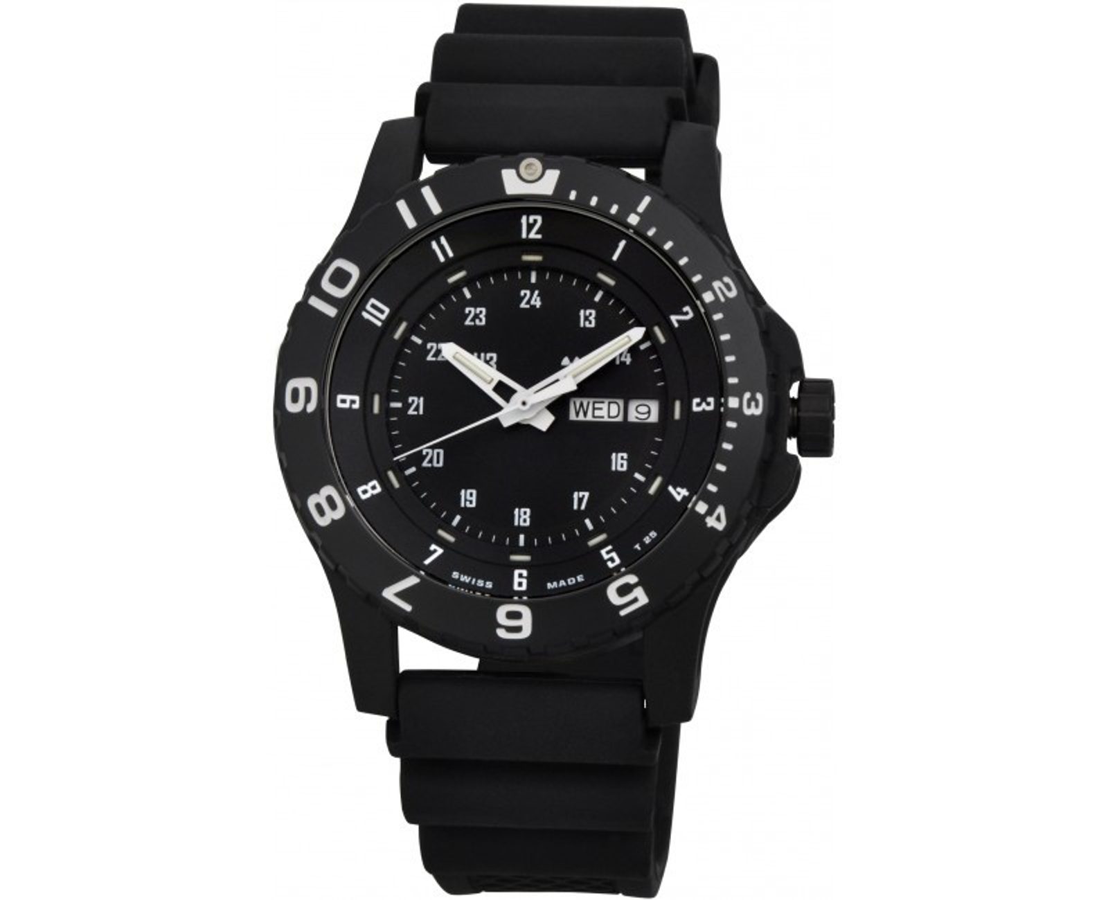 Hodinky jsou díky dvojité konstrukci pouzdra a vysoké vodotěsnosti vhodné do velmi náročného prostředí. Ve dne krásně kontrastují bílé indexy na černém pozadí, zatímco v noci oceníte promyšlnou luminiscenci - zeleně číslovky 1-11, 12 oranžově, ručičky a luneta také zeleně.