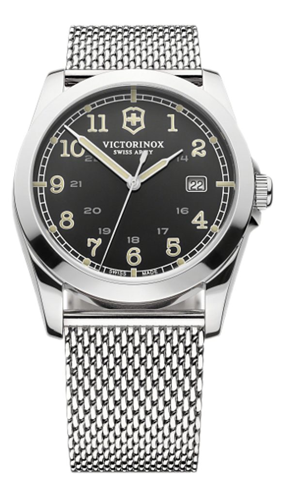 Švýcarské hodinky Victorinox z modelové řady Infantry s označením 241585 mají kvalitní ocelové pouzdro a velmi odolné safírové antireflexní sklíčko. Model Victorinox Infantry Chrono 241585 je vybaven quartzovým strojkem Ronda 715. Ukazatel data je umístěn na pozici čísla 3. Hodinky drží na ruce díky kvalitnímu pletenému řemínku z oceli.