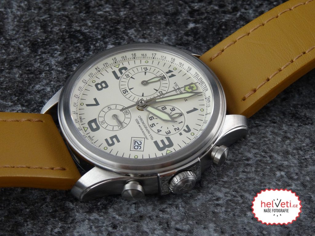 Švýcarské hodinky Victorinox z modelové řady Infantry Vintage s označením Chrono 241579 mají stopky a velmi odolné safírové antireflexní sklíčko.