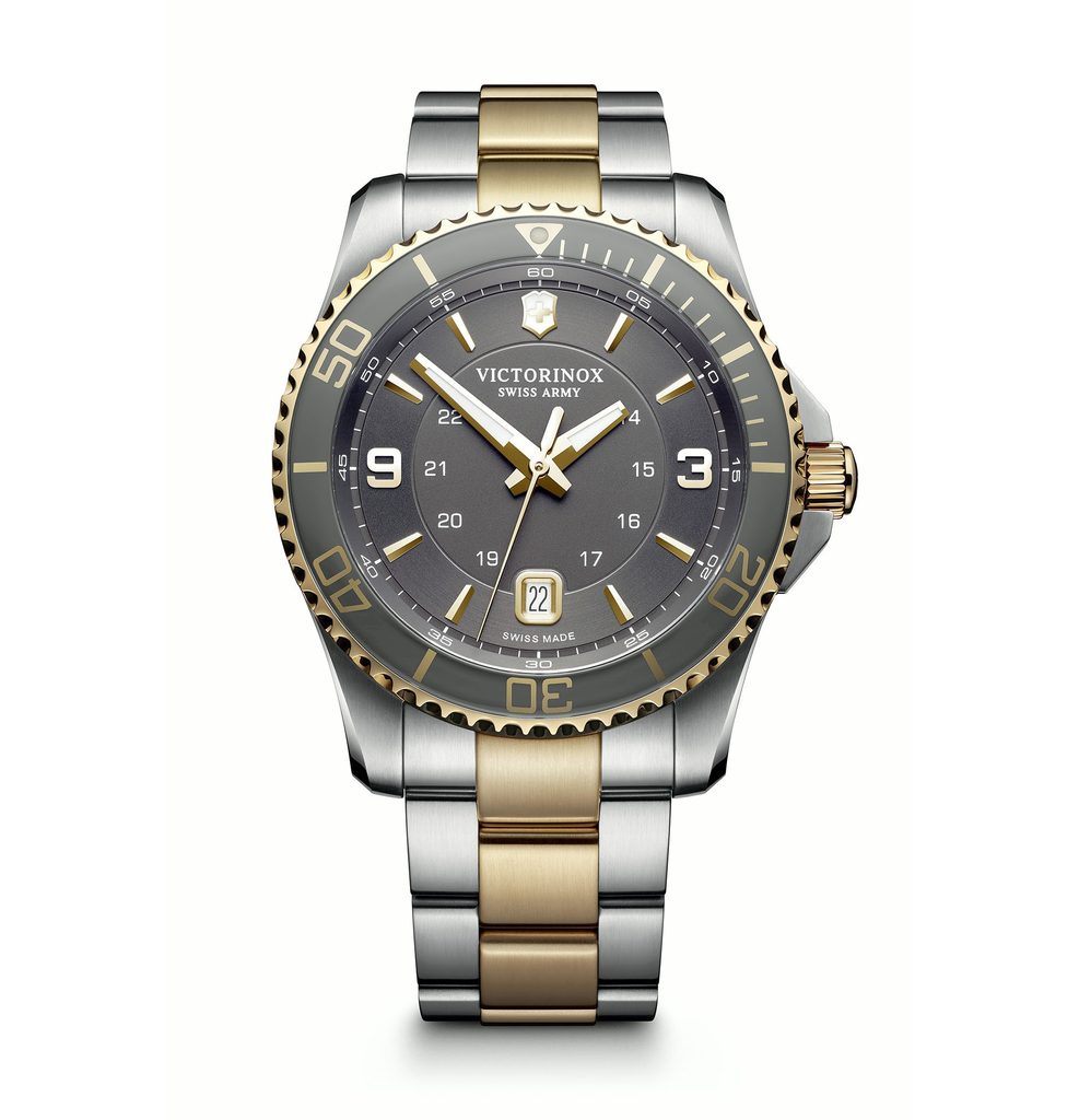 Pánské švýcarské hodinky Victorinox z modelové řady Maverick s označením 241825 mají kulaté ocelové pouzdro, antireflexní safírové sklíčko, ukazatel data na 6. pozici a jednosměrně otočnou lunetu.