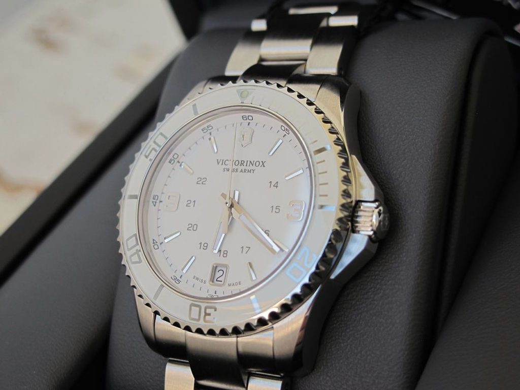 Dámské švýcarské hodinky Victorinox z modelové řady Maverick s označením 241699 mají kulaté ocelové pouzdro, antireflexní safírové sklíčko, ukazatel data a otočnou lunetu.