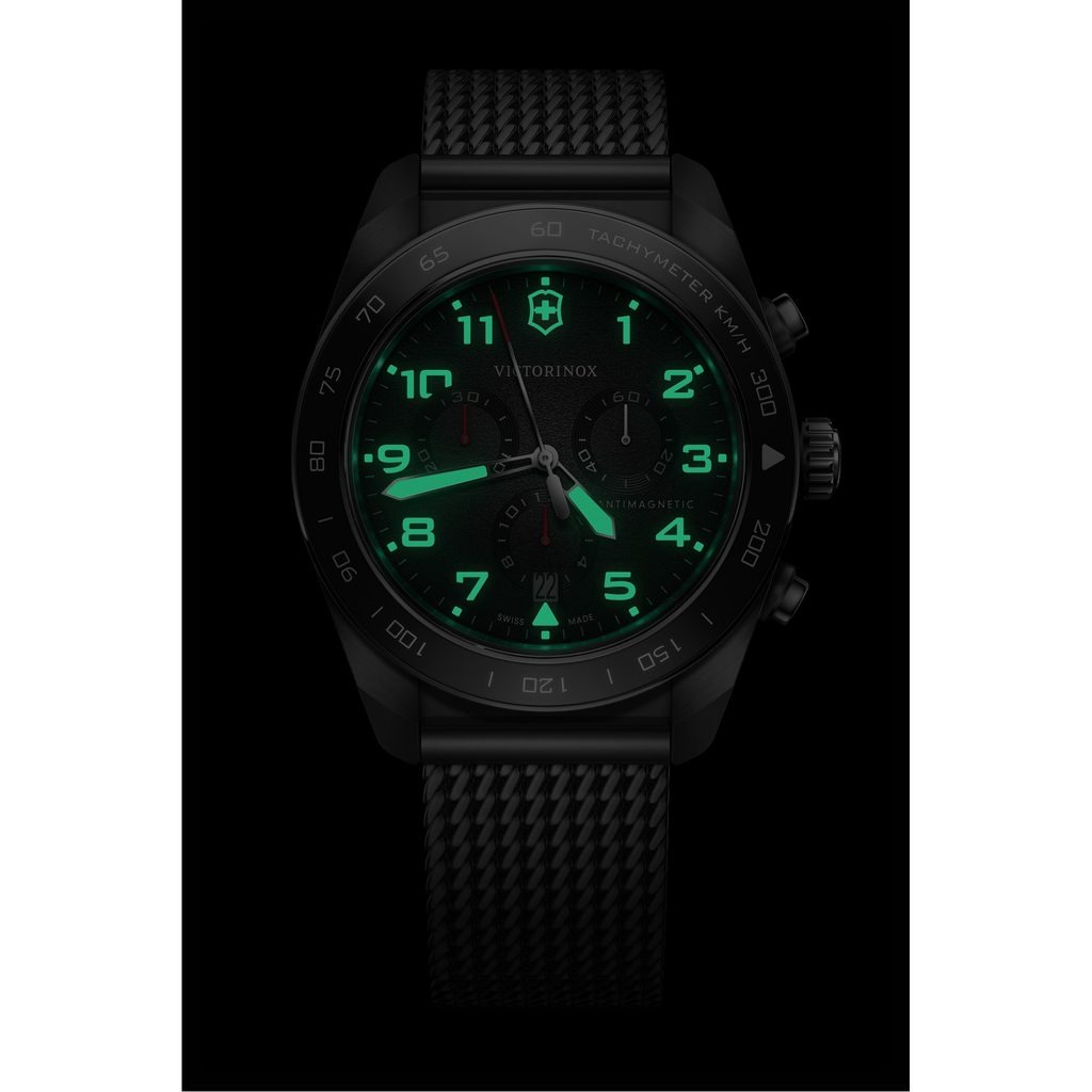 Model Victorinox Swiss Army Chrono 242048 je poháněn švýcarským quartzovým strojkem Ronda 5030.D, který disponuje ukazatelem data a stopkami. Na ručkách a reliéfních číslicích se nachází bohatá vrstva nátěru SuperLuminovova.