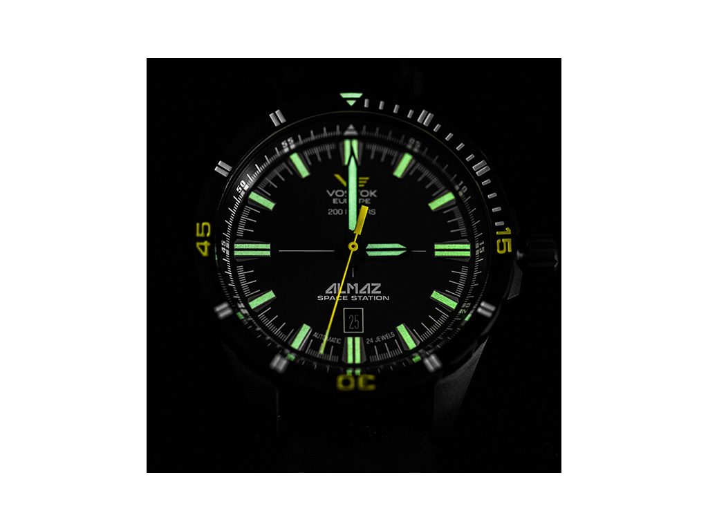 Pánské hodinky Vostok Europe Almaz Automatic Line NH35A/320C257 z modelové řady Almaz Space Station. Program Almaz byla série vojenských vesmírných stanic vyslaných do vesmíru Sovětským svazem pod názvem Saljut. Úspěšně obydleny byly dva Almazy – Saljut 3 a Saljut 5. Součástí programu byl vývoj lodí TKS, majících za úkol dopravovat kosmonauty a zásoby na Almazy, nakonec ale kosmonauty na stanice vozily lodě Sojuz. Lodě TKS byly pouze vyzkoušeny v bezpilotním režimu, pilotované lety byly zrušeny.
