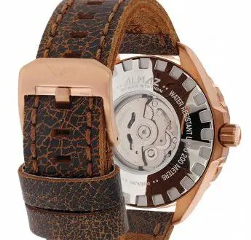 Voděodolnost modelu Almaz Bronze Line NH35/320O507 je stanovena na 20 ATM a je podpořena šroubovací korunkou.