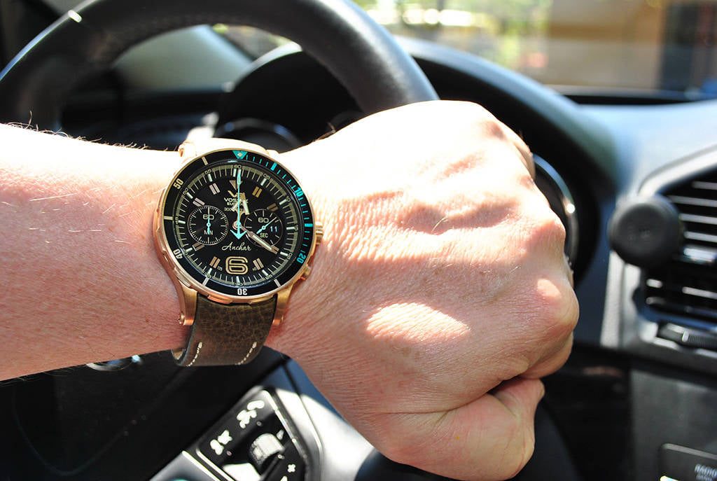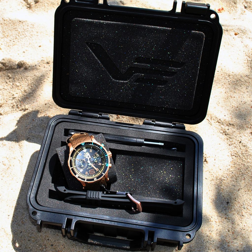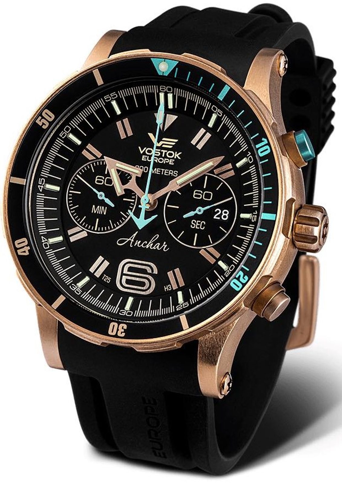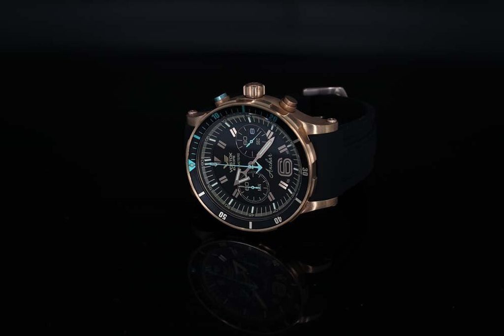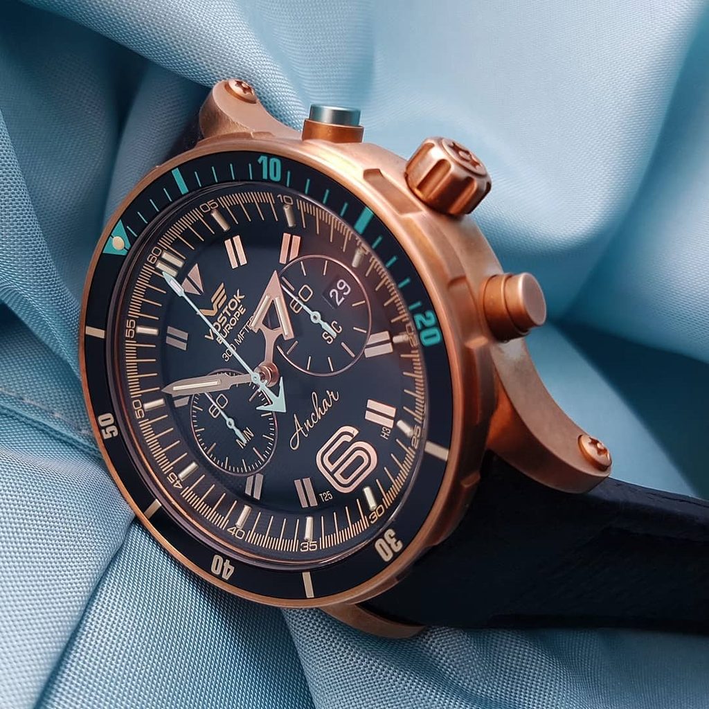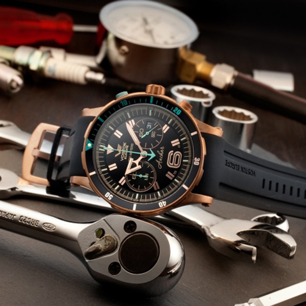 Pouzdro hodinek Anchar Submarine Chrono Line 6S21/510O585 je bronzové. Uvnitř se skrývá japonský bateriový strojek Miyota 6S21. Na tradiční pozici 3 najdeme praktický ukazatel data. Hodinky jsou také vybaveny funkcí stopek a jednosměrnou otočnou lunetou s funkcí tichého timeru.