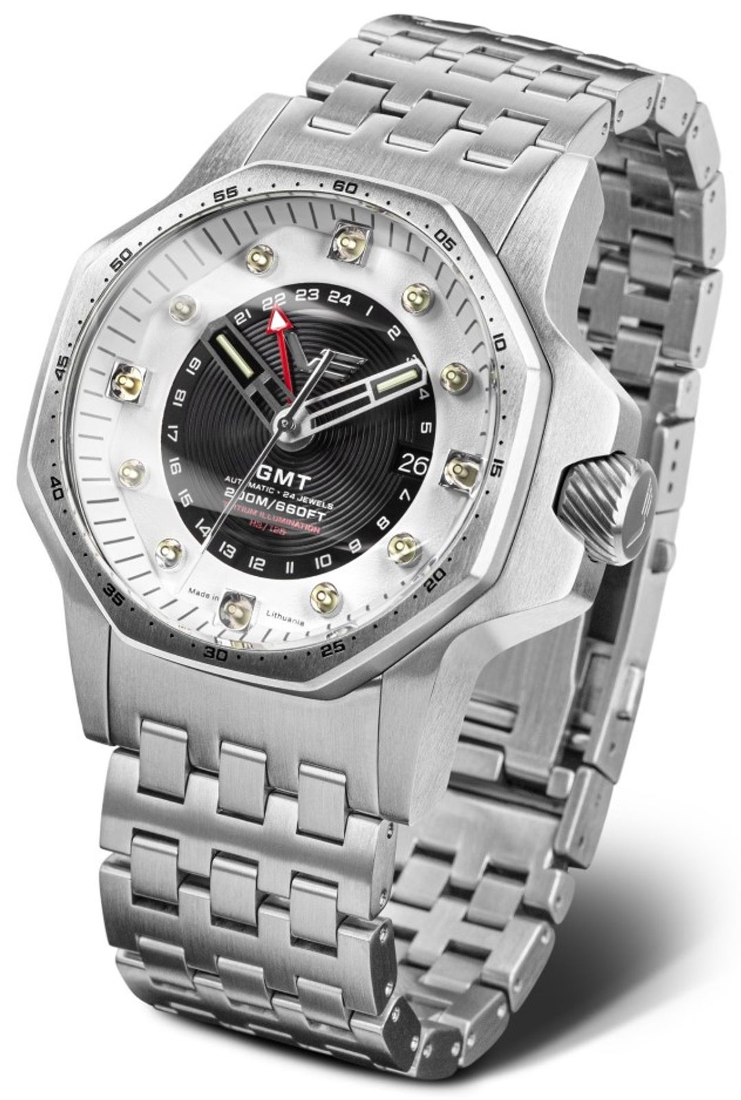 Číselník chrání minerální tvrzené sklíčko K1 s vnitřní antireflexní úpravou. Dokonalou čitelnost za tmy zajišťuje celkem 14 tritiových kapslí. Najdeme je na indexech, ručkách a na lunetě. Díky svému průměru 48 mm budou ideální volbou pro příznivce větších hodinek.