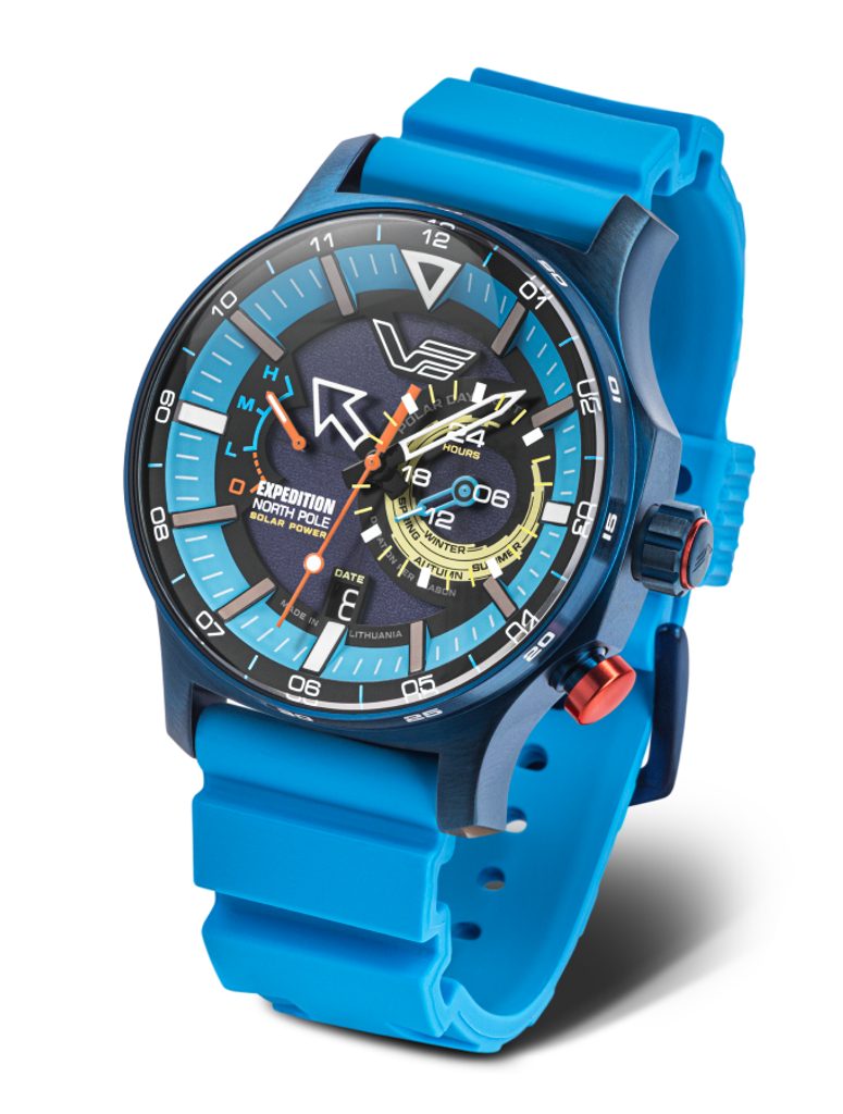 Pánské hodinky Vostok Europe Expedition North Pole Solar Power 24h VS57-595D736B z modelové řady Expediton North Pole-1 odkazují na první sovětskou plovoucí stanici na ledové kře. Stanice byla v provozu devět měsíců (274 dnů). Kra, na které stanice stála, za tuto dobu urazila 2 850 km a dostala se až k východnímu pobřeží Grónska.