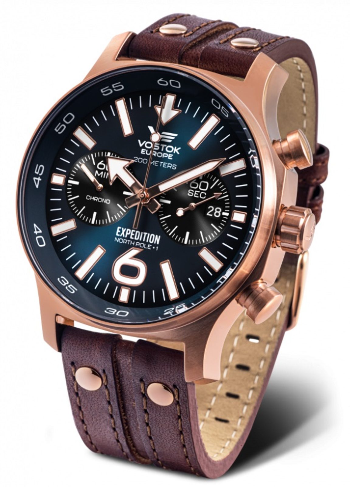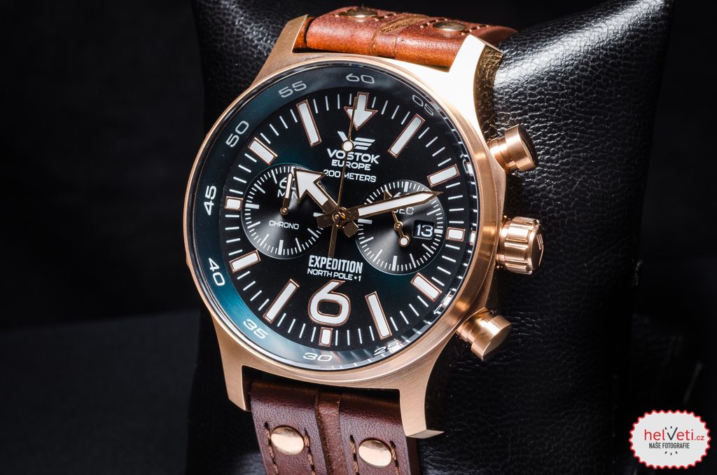 Pánské hodinky Vostok Europe Expediton North Pole-1 Chrono Line 6S21-595B645 z modelové řady Expediton North Pole-1 odkazují na první sovětskou plovoucí stanici na ledové kře. Stanice byla v provozu devět měsíců (274 dnů). Kra, na které stanice stála, za tuto dobu urazila 2 850 km a dostala se až k východnímu pobřeží Grónska.