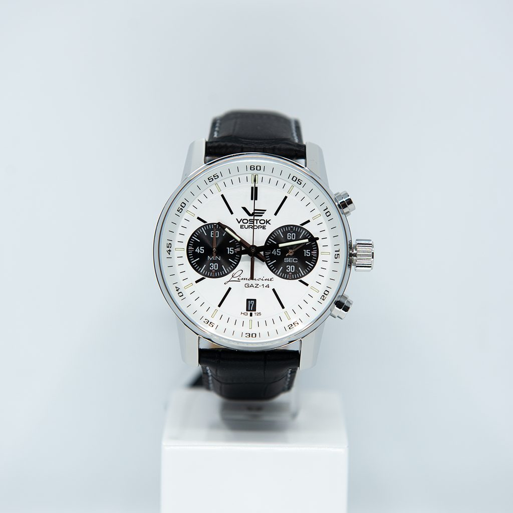 Pouzdro hodinek Vostok Europe GAZ-14 Limouzine Chrono Tritium 6S21/565A598 je vyrobeno z ušlechtilé oceli. Uvnitř najdeme japonský bateriový strojek Miyota 6S21. Na pozici 6 se nachází praktický ukazatel data. Centrální ručka a subčíselník na pozici 9 náleží stopkám.