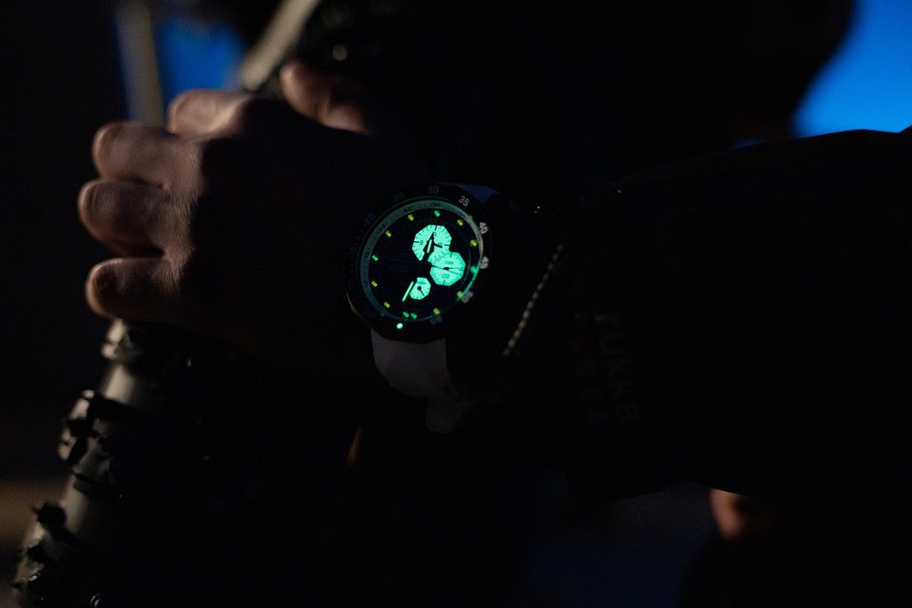 Číselník chrání minerální tvrzené sklíčko s vnitřní antireflexní úpravou. Dokonalou čitelnost za tmy zajišťuje celkem 15 tritiových kapslí od švýcarské společnosti MB Microtech AG. Najdeme je na indexech a minutové a hodinové ručce. Díky svému průměru 49 mm budou ideální volbou pro příznivce větších hodinek.