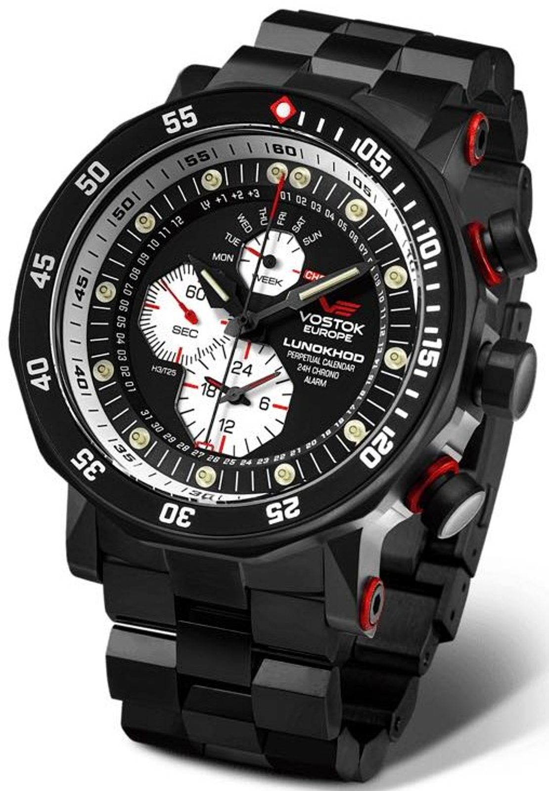 Pouzdro hodinek Vostok Europe Lunochod-2 Multifuncional Line YM86/620C635B je vyrobeno z ušlechtilé oceli s černou PVD úpravou. Uvnitř se skrývá bateriový japonský strojek S.EPSON YM86. Subciferník na pozici 12 zobrazuje aktuální den v týdnu. Centrální ručka s vidlicí na konci slouží jako ukazatel aktuálního dne v měsíci. Číselná škála na hlavním číselníku je rozdělena do tří sektorů: v poloze 0-36 minut je sektor dnů v měsíci, v poloze 38-52 minut je sektor měsíců a v poloze 54-58 minut je sektor let (čtyřletý cyklus s přestupným rokem). Hodinky dále disponují funkcí stopek, budíku a jednosměrnou otočnou lunetou. Dále disponují i heliovým ventilem.