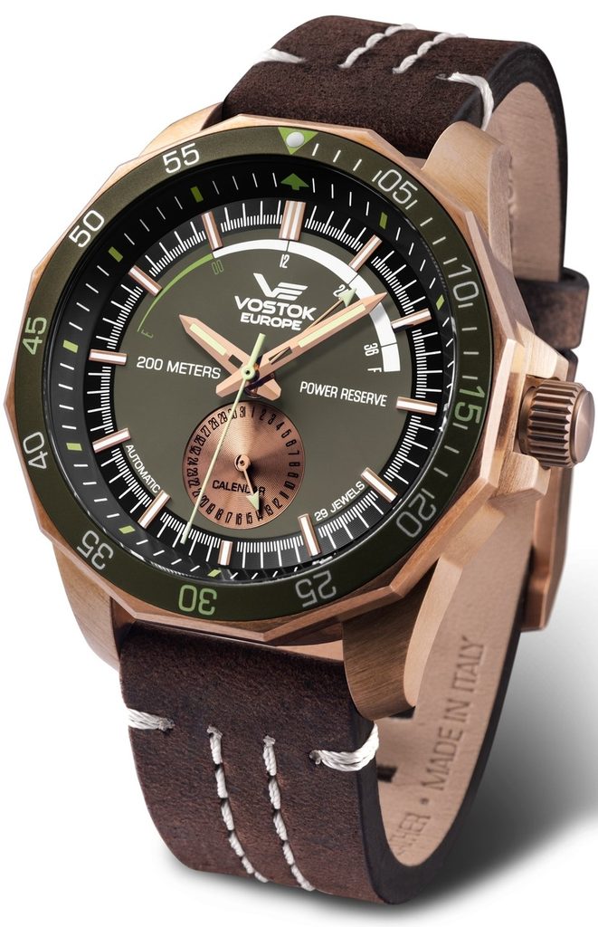 Pouzdro hodinek Vostok Europe N-1 Rocket Automatic Power Reserve NE57-225O565 je bronzové. Uvnitř se skrývá japonský mechanický strojek Seiko NE57 s automatickým nátahem a možností ručního nátahu. Na pozici 6 najdeme praktický ukazatel data. Strojek disponuje 29 kameny a rezervou chodu 41 hodin. Na pozici 6 se nachází subciferník s ukazatelem data. Díky průhlednému dýnku můžete pozorovat práci strojku. Luneta hodinek je jednosměrně otočná.