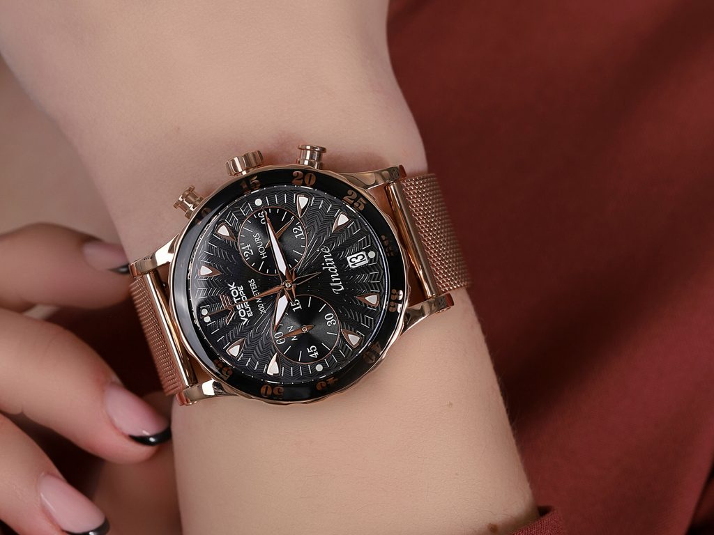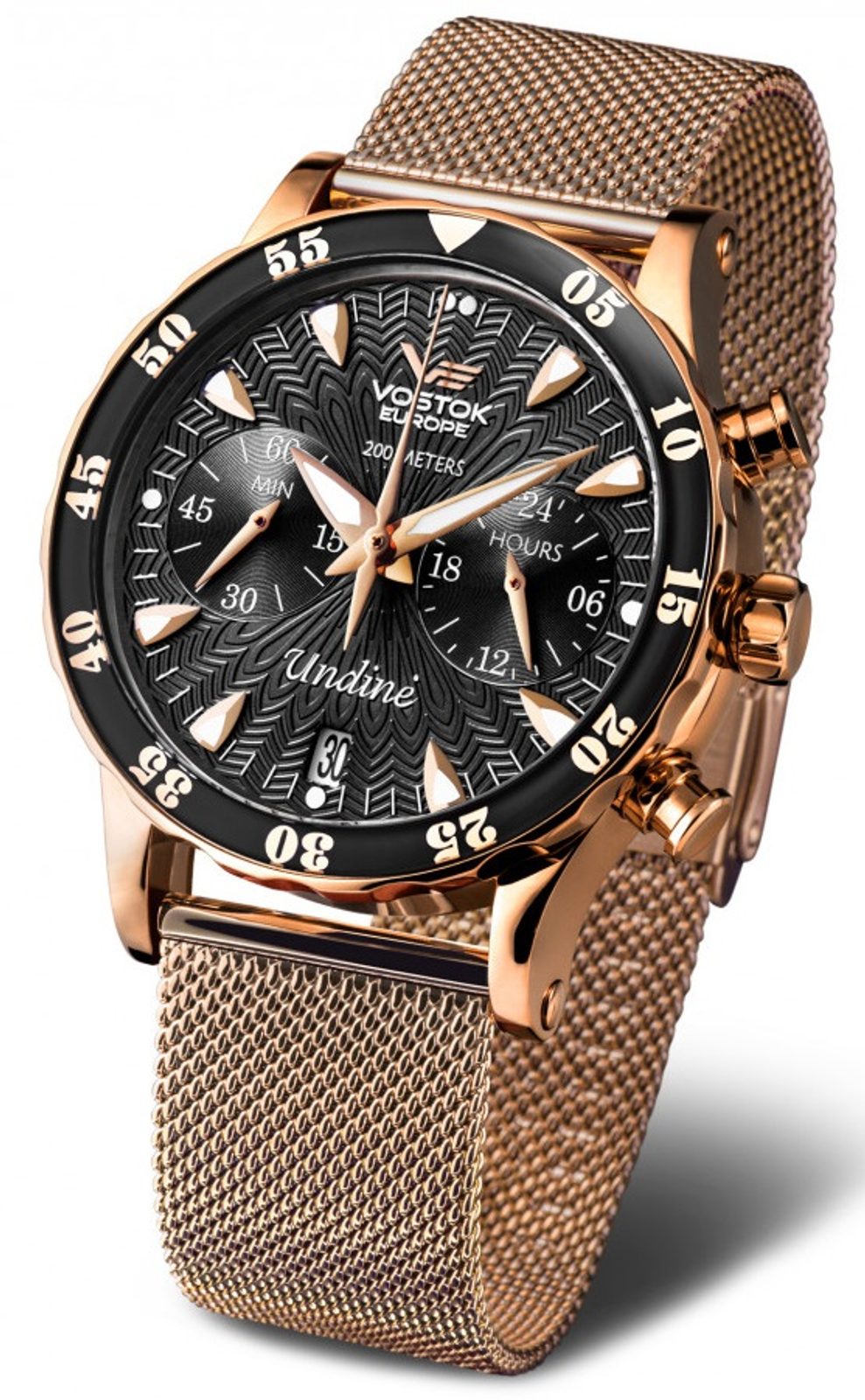 Pouzdro hodinek Vostok Europe Undine VK64-515B568B je vyrobeno z ušlechtilé oceli se zlatou PVD úpravou. Uvnitř se skrývá japonský bateriový strojek Seiko VK64. Ten disponuje stopkami a ukazatelem data. Subčíselník na pozici 3 slouží jako ukazatel času ve formátu 24 hodin. Číselník chrání tvrzené minerální sklíčko K1 s vnitřní antireflexní úpravou.
