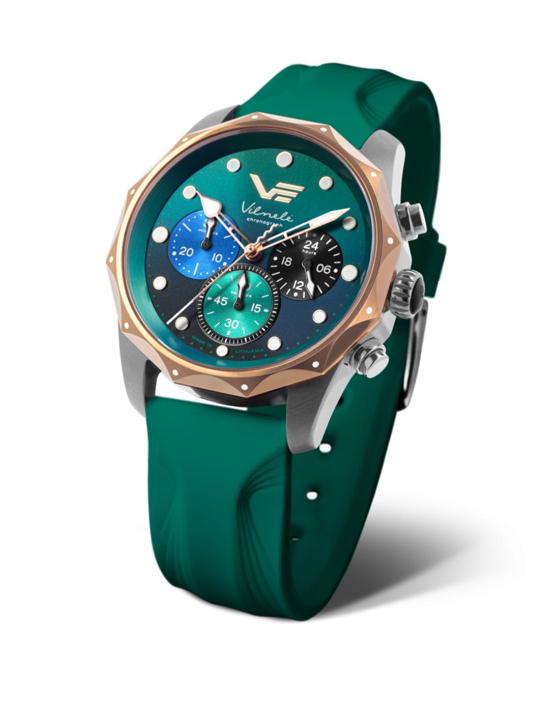 Pouzdro hodinek Vostok Europe Vilnele Chrono JS20-125E752B je vyrobeno z ušlechtilé oceli a zdobí jej pozlacená luneta, která má svým atypickým tvarem připomínat pohyb řeky Vilnelé. Srdcem hodinek je japonský bateriový strojek Miyota JS20. Ten je vybaven stopkami, což podtrhuje sportovní vzhled hodinek. Pro lepší čitelnost za zhoršených světelných podmínek jsou ručičky a indexy opatřeny luminiscenčním nátěrem Superluminova. Vše chrání safírové sklíčko s antireflexní úpravou.