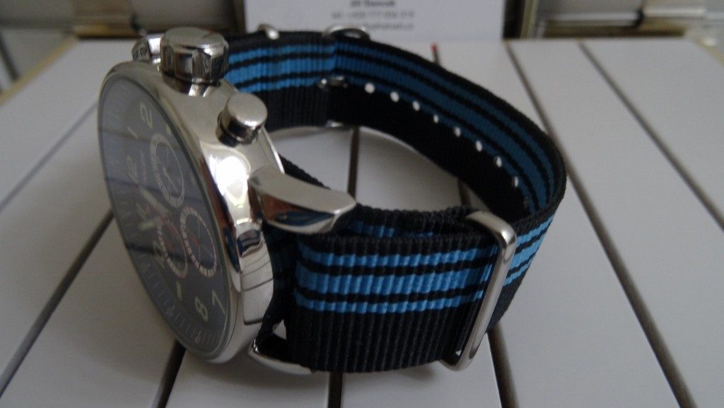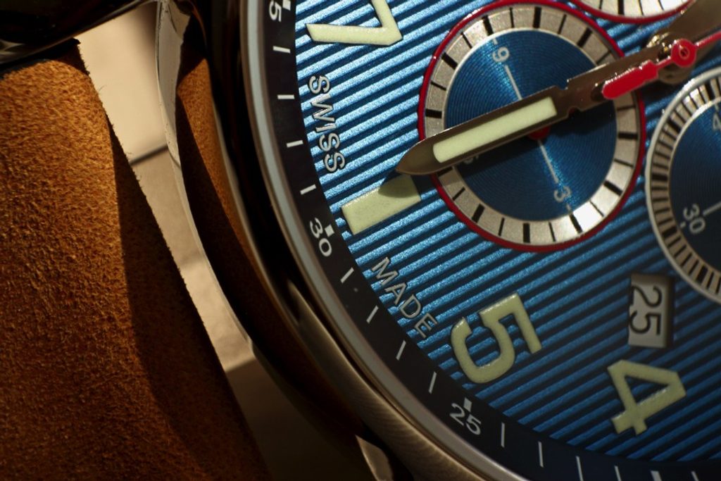 Ve středu číselníku se nachází tři malé ciferníčky - dva pro potřeby stopek a pravý pro vteřinovou ručičku. V pravé spodní části naleznete datumovku.