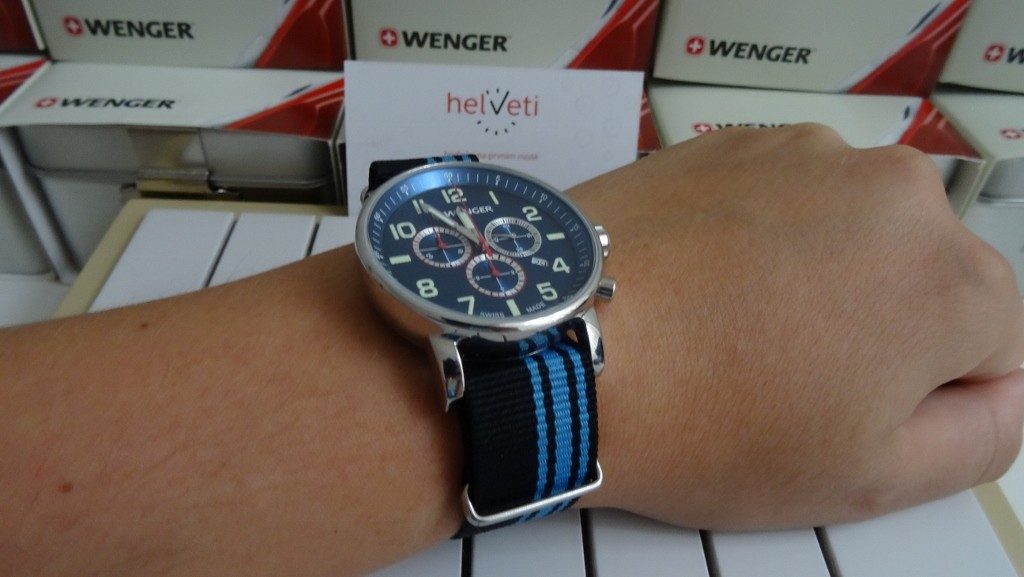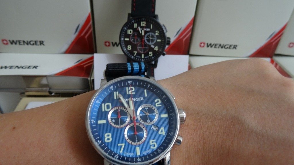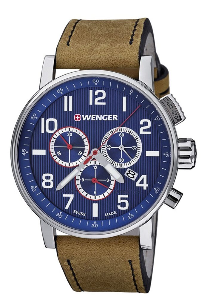 Model Wenger Attitude Chrono 01.0343.101, navazuje na model Wenger Commando Chrono 01.1243.101. Liší se posunutím loga Wenger níže a přidáním číslice 12 na modrý ciferník hodinek. Hodinky spojuje velké leštěné ocelové pouzdro s tlačítky stopek v jeho pravé části. Horní tlačítko má hranatý tvar s nápisem start-stop vycházející z designu klasických stopek pro lepší orientaci při měření času. Atraktivní ciferník tohoto modelu kombinuje krásné odstíny modré ve svislých pruzích s bílou a červenou barvou. Na jeho obvodu najdete dobře čitelné luminiscentní indexy ukryté pod minerálním sklíčkem se safírovou úpravou. Osvětlení ve tmě zajišťuje technologie SuperLuminova.