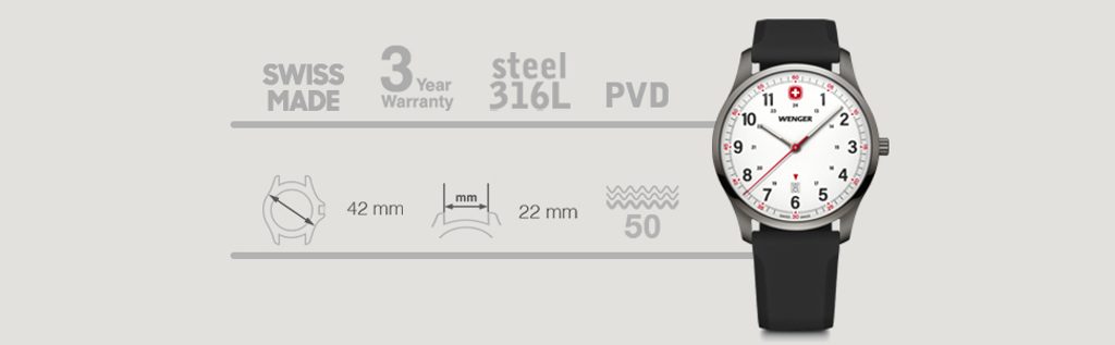 Přehlednému ciferníku dominuje červený švýcarský kříž na pozici 12 hodiny, který Wenger používal u svých modelů hodinek z ranné produkce. Další skvělou vlastností tohoto modelu jsou luminiscenční ručky s úpravou Super-LumiNova®. Pouzdro hodinek je vyrobeno z nerezavé oceli s černou PVD úpravou, číselník je chráněn minerálním sklíčkem se safírovou úpravou. Na ciferníku nalezneme také 24 hodinový ukazatel času (tzv. vojenský čas).