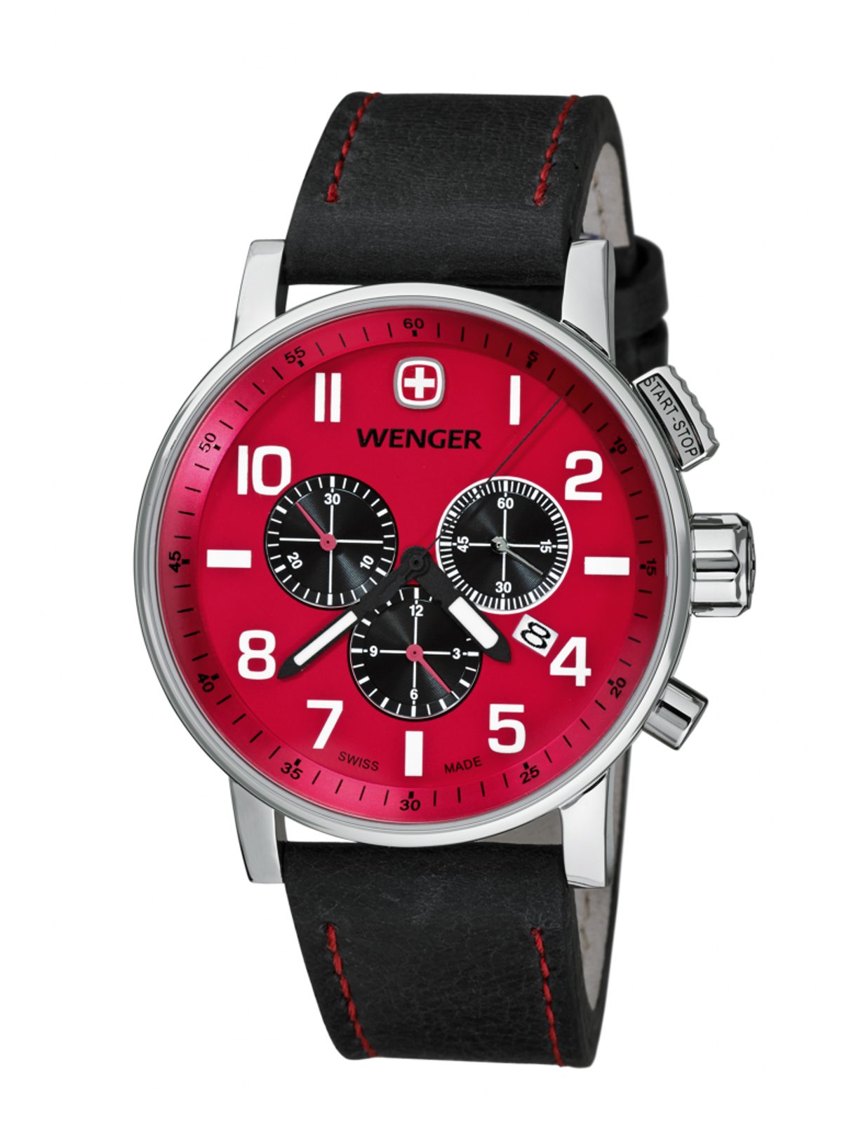 Modelová řada Commando byla pro rok 2014 vylepšena o velmi povedené modely s chronografem. Spojuje je velké leštěné ocelové pouzdro s tlačítky stopek v jeho pravé části. Horní tlačítko má hranatý tvar s nápisem start-stop vycházející z designu klasických stopek pro lepší orientaci při měření času. Výhodou je nevypouklé safírové sklíčko a kvalitní 4mm tlustý kožený řemínek. Velký přehledný ciferník má po obvodu dobře čitelné luminiscentní indexy. V jeho středu se nachází tři malé ciferníčky. Dva pro potřeby stopek a pravý pro vteřinovou ručičku. Model Wenger Commando Chrono 01.1243.103 se dodává s černým řemínkem s červeným prošitím. Ciferník má podklad červené barvy. Hodinky jsou sportovně laděné, ale jsou vhodným doplňkem také k obleku, nebo slušnému oblečení.