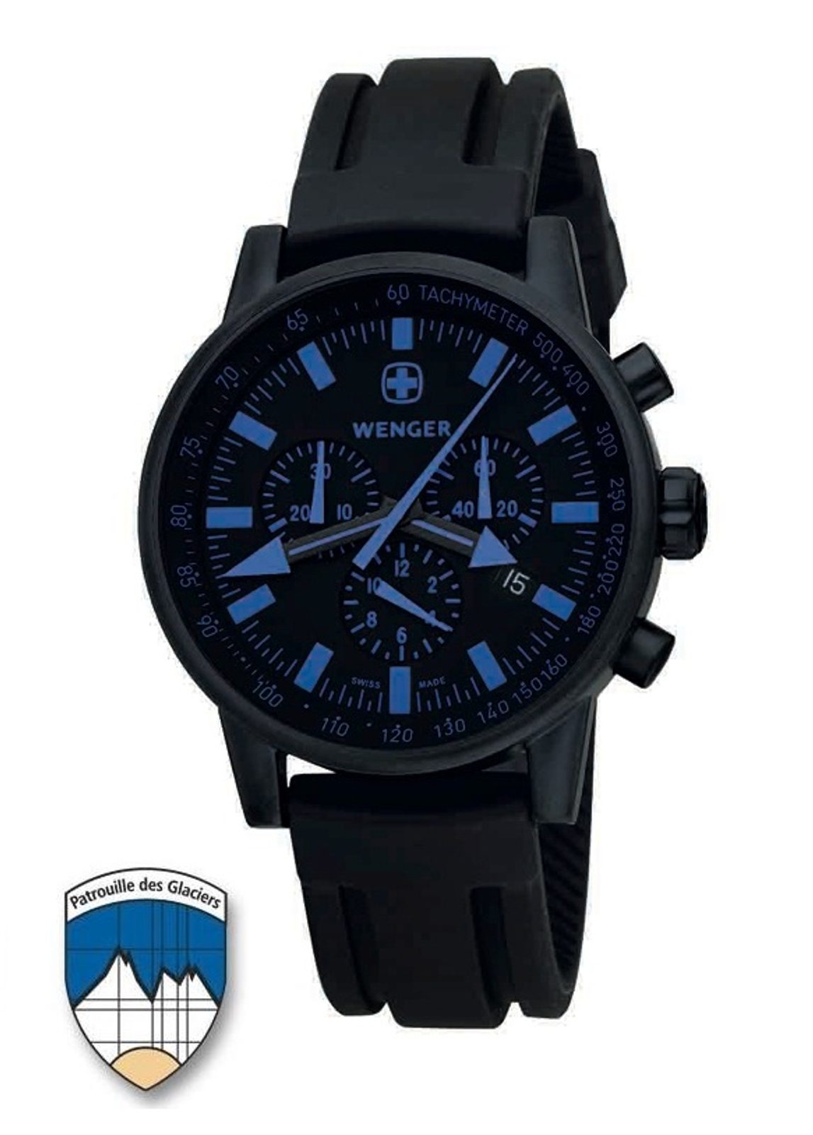 Poslední kus skladem. Model Commando PDG 70892 disponuje ocelovým pouzdrem s PVD úpravou, minerálním sklem se safírovou úpravou a velkým černomodrým ciferníkem s chronografem a tachymetrem. Můžete si tak změřit například uběhnutý čas, ale i rychlost. Silikonový pásek v černém provedení je příjemný na dotek. Zkratka PDG znamená Patrouille des Glaciers, což je švýcarský lyžařský závod pořádaný švýcarskou armádou - více informací zde. Právě tento závod se rozhodla firma Wenger sponzorovat pomocí tohoto modelu. Logo závodu je umístěno na dýnku hodinek.